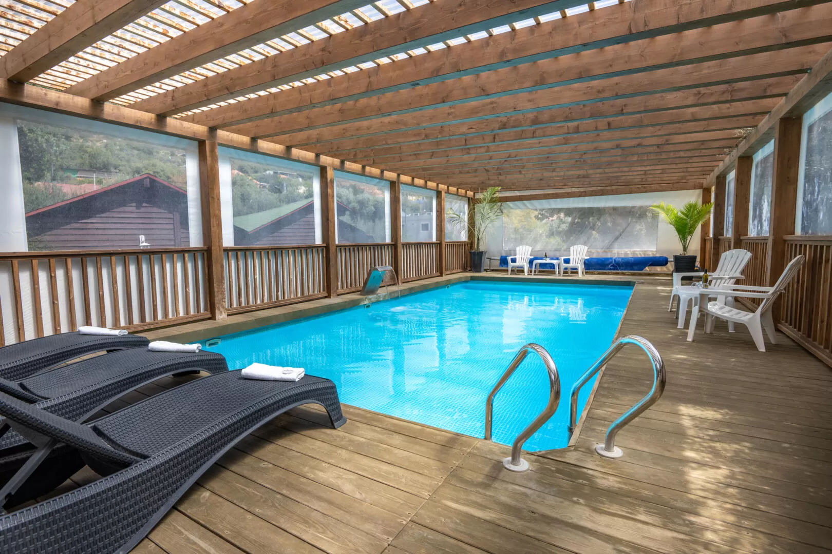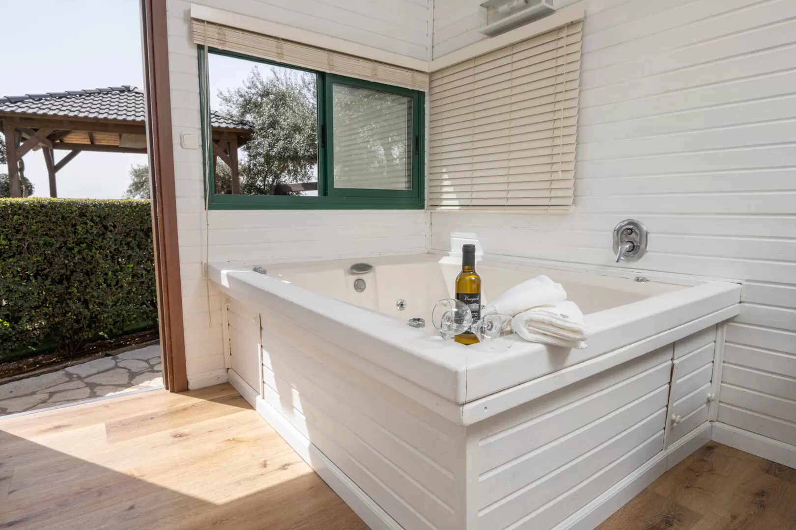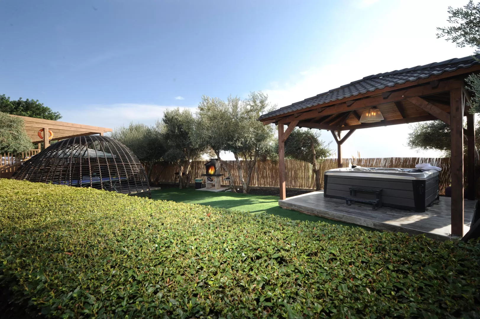 בבקתות יש ג'קוזי זוגי פרטי ומפנק, וחדר נפרד ללינת ילדים. במתחם המשותף יחכה לכם מטבח מושקע ומאובזר לבישול מלא כולל מכונת קפה, שממוקם במבנה סגור ומקורה. הבריכה הגדולה יושבת על דק מוגבה שצופה לנוף, מחוממת כל השנה ומקורה. ג'קוזי ספא מקורה ממוקם גם הוא במתחם המשותף, ולצידו עמדת מנגל לשימוש האורחים, שלל פינות ישיבה נעימות, ושולחן פינג פונג.