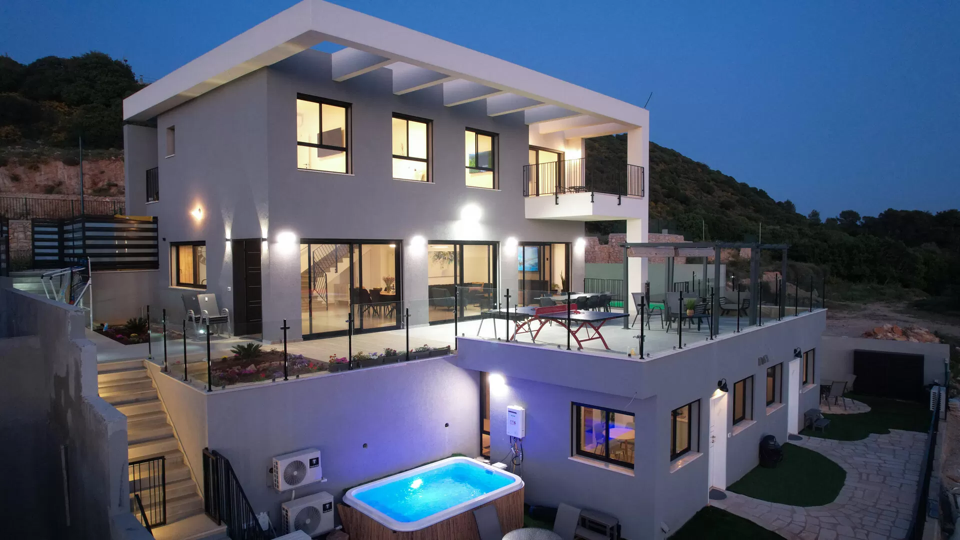 בווילה - בחדר המאסטר יש מקלחון זוגי מפנק שבו שני ראשי גשם ויציאה למרפסת נוף פרטית. הסלון מעוצב בהקפדה, עם טלויזיה חכמה בגודל 75 אינץ', קמין חשמלי ומטבח מאובזר ביותר. בחדרי השינה שבמפלס התחתון (הסוויטות) תמצאו מטבחים מאובזרים, חדרי רחצה מאובזרים, ג'קוזי ספא לצד כל סוויטה, ועמדת מנגל . עוד במתחם החוץ של הוילה תמצאו בריכה מחוממת, שולחן פינג פונג, מתקן לכדורסל והמון פינות רביצה.