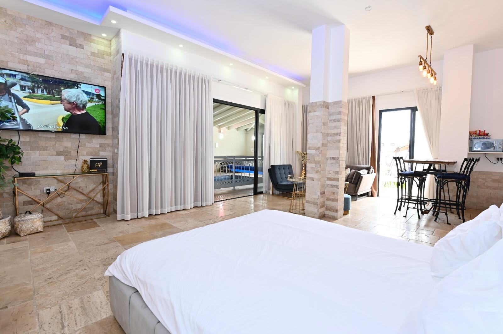 בחלל הפנים של הסוויטה, כאמור, תמצאו בריכה פרטית מחוממת וג'קוזי ספא, ערסל ופינת ישיבה. לסוויטה יש מרפסת פרטית עם עמדת מנגל ופינת אוכל, ואזור חוץ נוסף עם מיטות שיזוף ונדנדה.