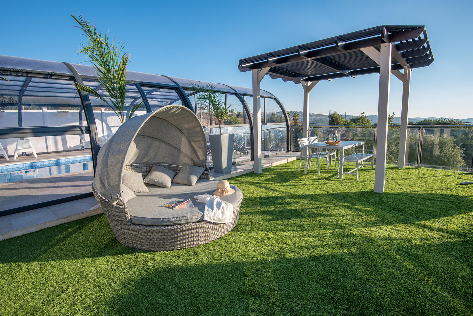 מתחם החוץ כולל בריכה מחוממת עם משטחי רביצה ולצידה ג'קוזי ספא, שניהם מקורים בקירוי חצי מודולרי (הצדדים ניתנים לפתיחה) שניתן לנעול לבטיחות אם מתארחים עם ילדים.
