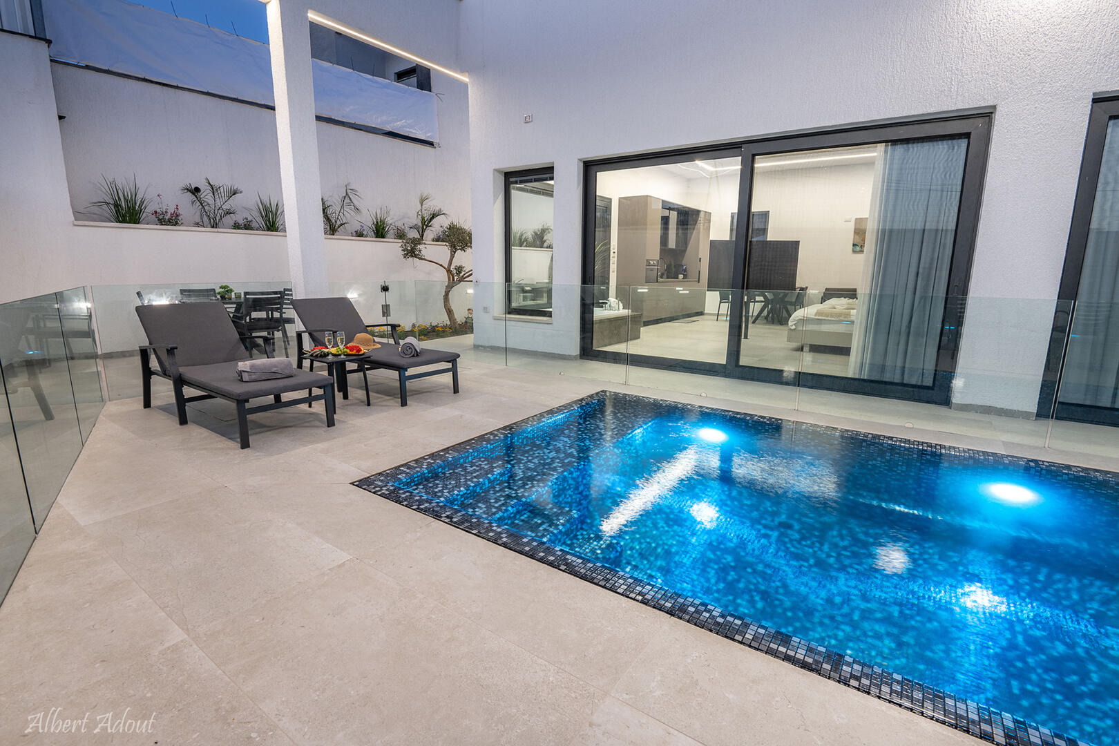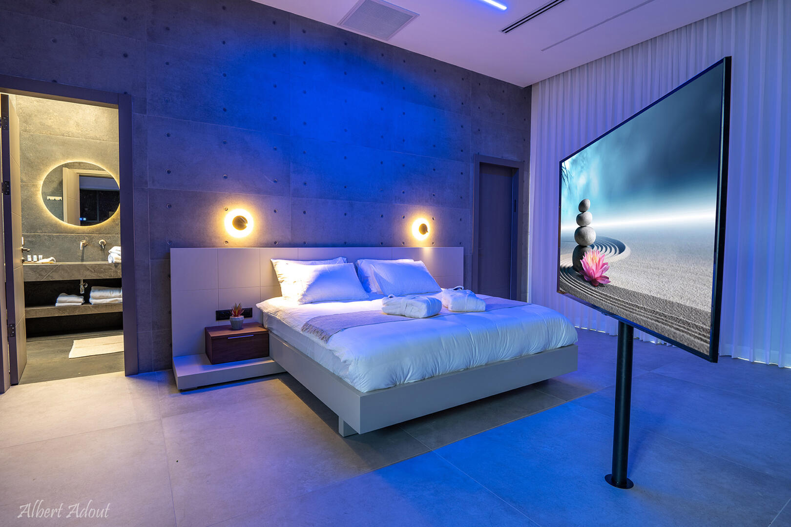 הסוויטה מעוצבת בסגנון מודרני ונקי, עם חלל מרווח ומאובזר היטב . הקירוי החשמלי והמתחם החוץ הסגור יוצרים בועה פרטית ומאפשרים שימוש בכל הפסילטיז בלי תלות במזג האוויר ולחוות חופשה איכותית בשקט ובפרטיות מלאה.