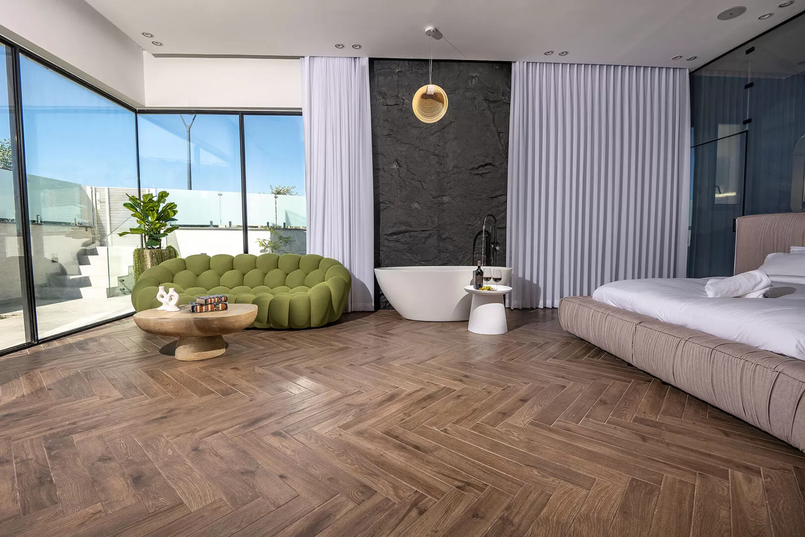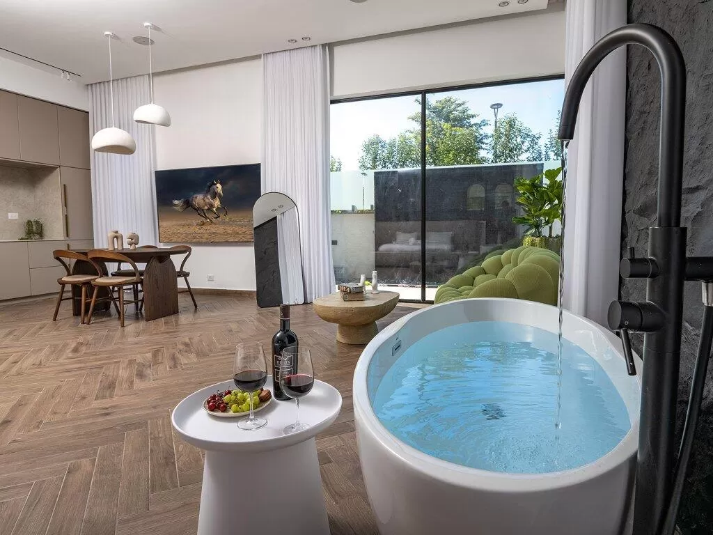 האווירה כאן מקנה רוגע ושלווה- החל מקיר שחור עם טקסטורה מעשה ידיו של אמן שמשדרג את חווית הרחצה באמבט סטנד אלון ועד לטאץ' המודרני שנוגע בכל פינה בסוויטה