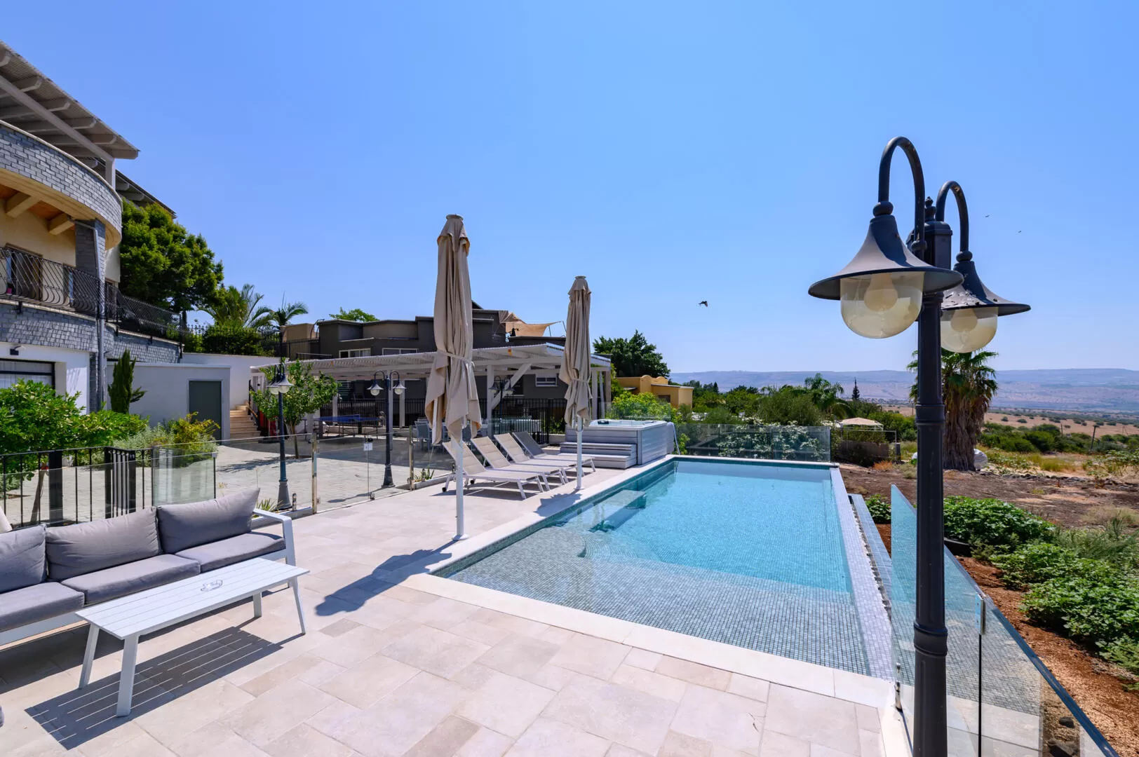מתחם החוץ מפנק במיוחד וכולל בריכת אינפיניטי עם נוף עוצר נשימה, שמשיות ומיטות שיזוף, וליד נמצא גם ג'קוזי ספא מפנק, מנגל, מטבח חוץ ושולחן אוכל גדול.