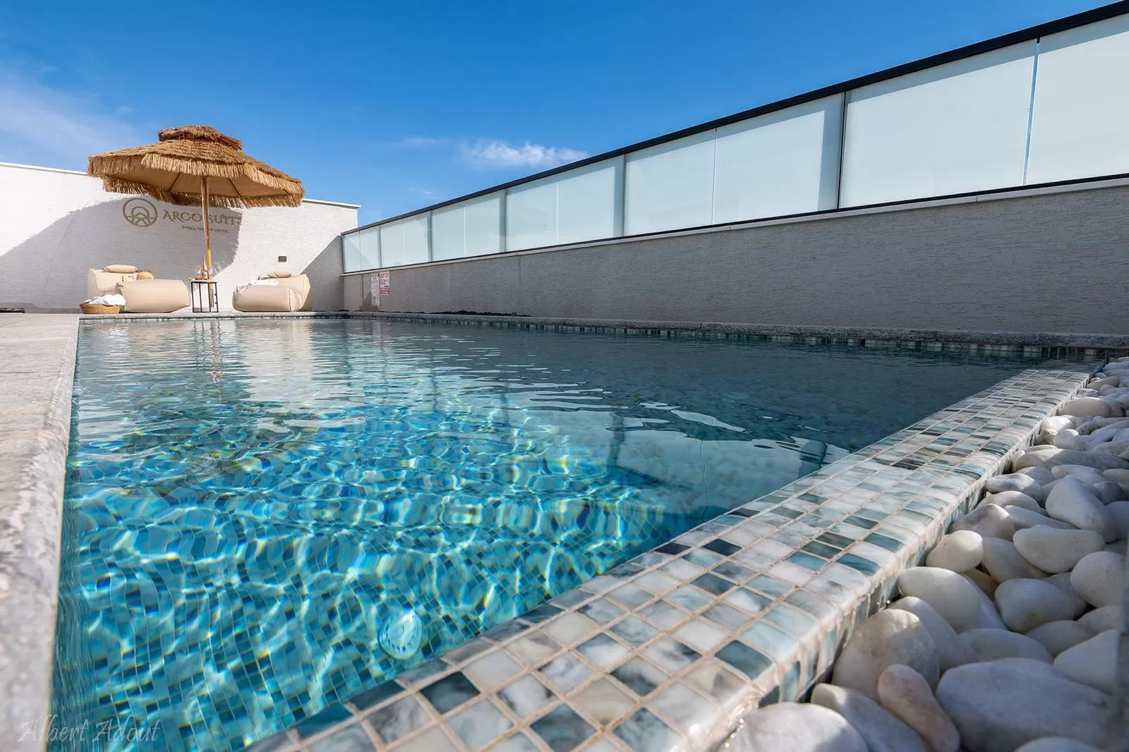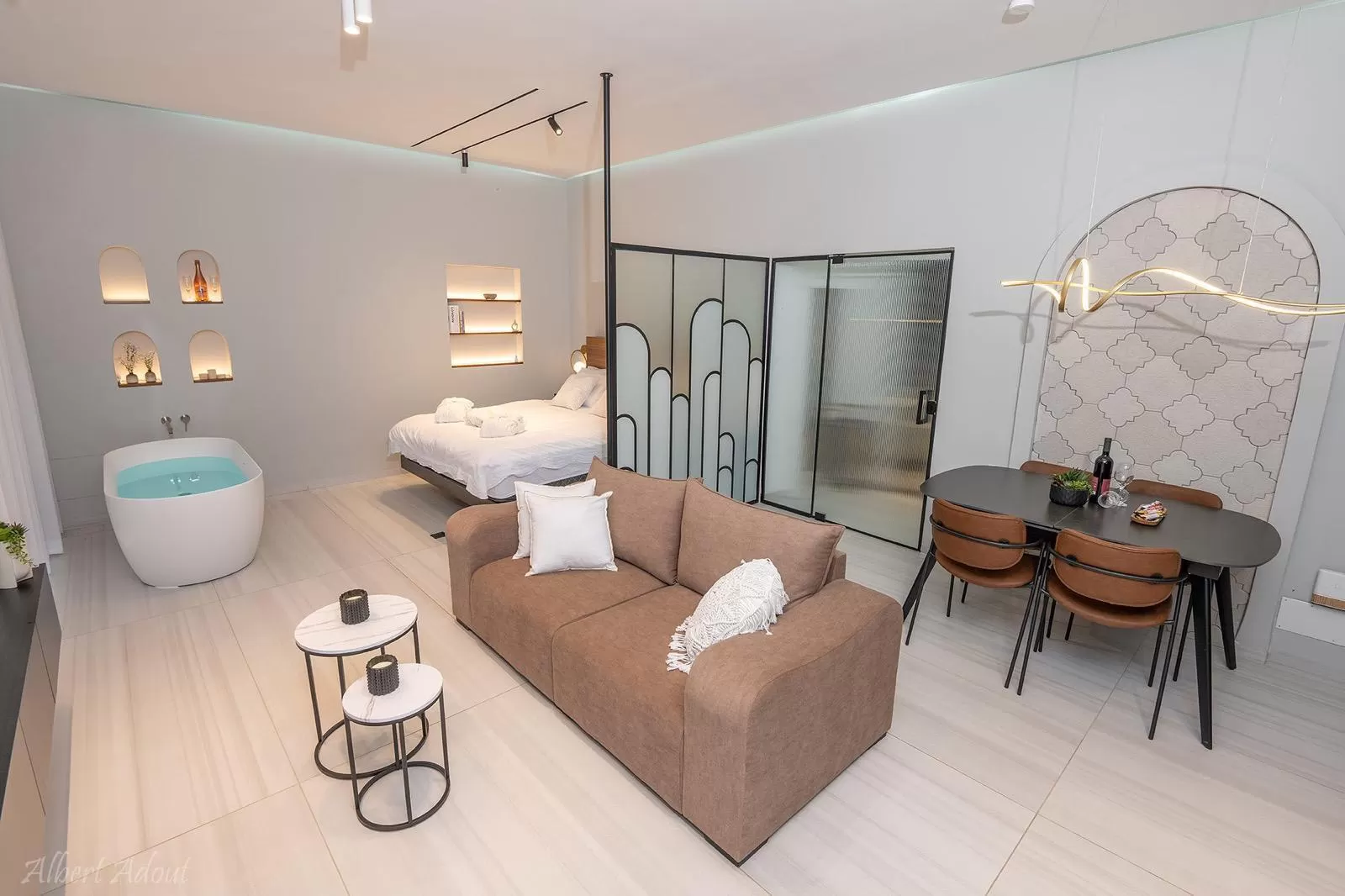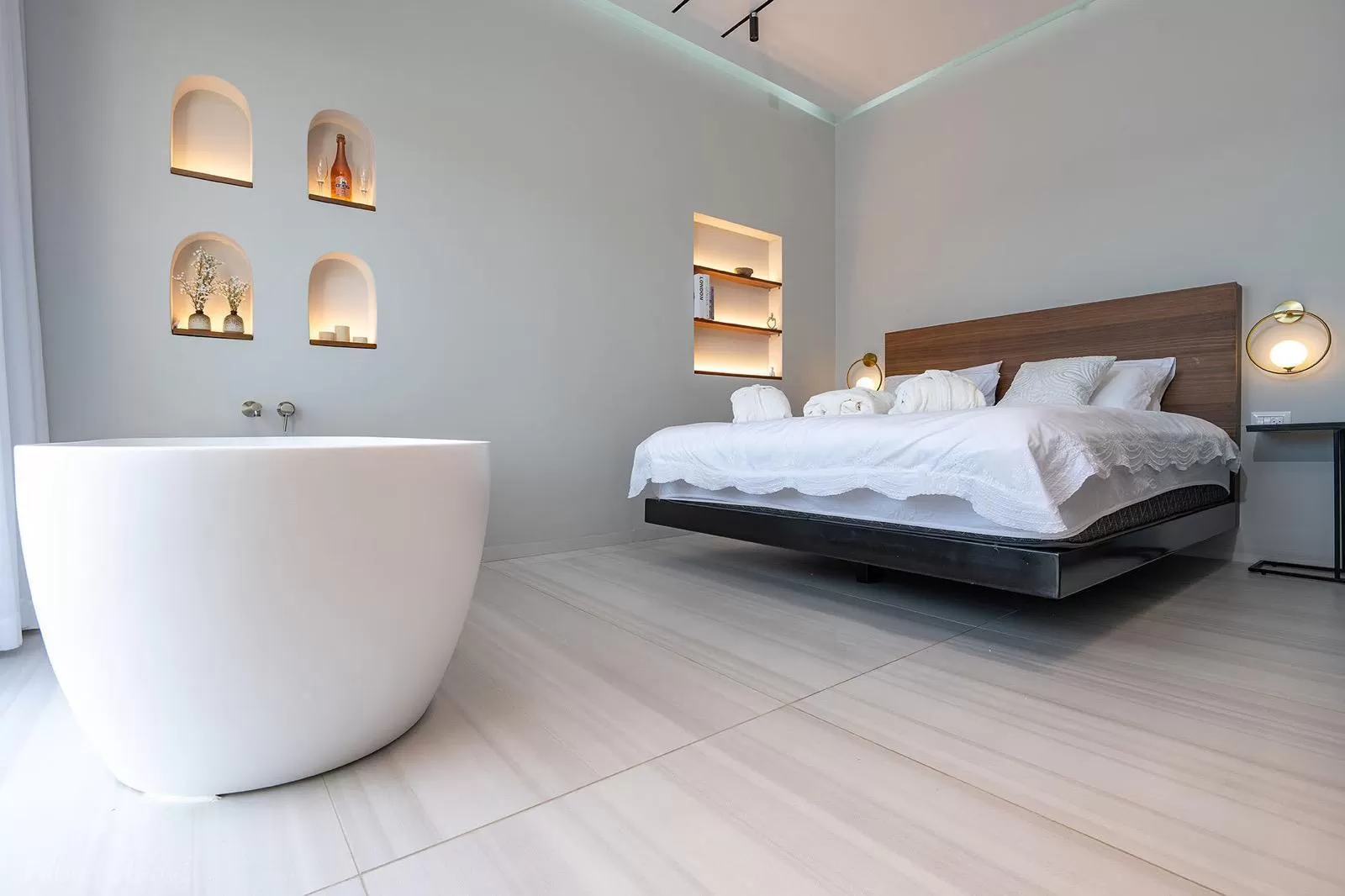 הסוויטה מעוצבת בקווים נקיים ורכים, עם קשתות שנותנות תחושה הרמונית ונעימה. המיטה הצפה מוסיפה טאץ' מודרני ומיוחד, והאמבט שממוקם מול הבריכה יוצר חוויה מפנקת ורגועה. הגומחות בקירות לא רק יפות, אלא גם מוסיפות עומק ועיצוב מעניין, והמשרבייה משתלבת ומוסיפה לאווירה. כל זה יוצר חלל שנעים להיות בו, עם חיבור טבעי בין הפנים לחוץ