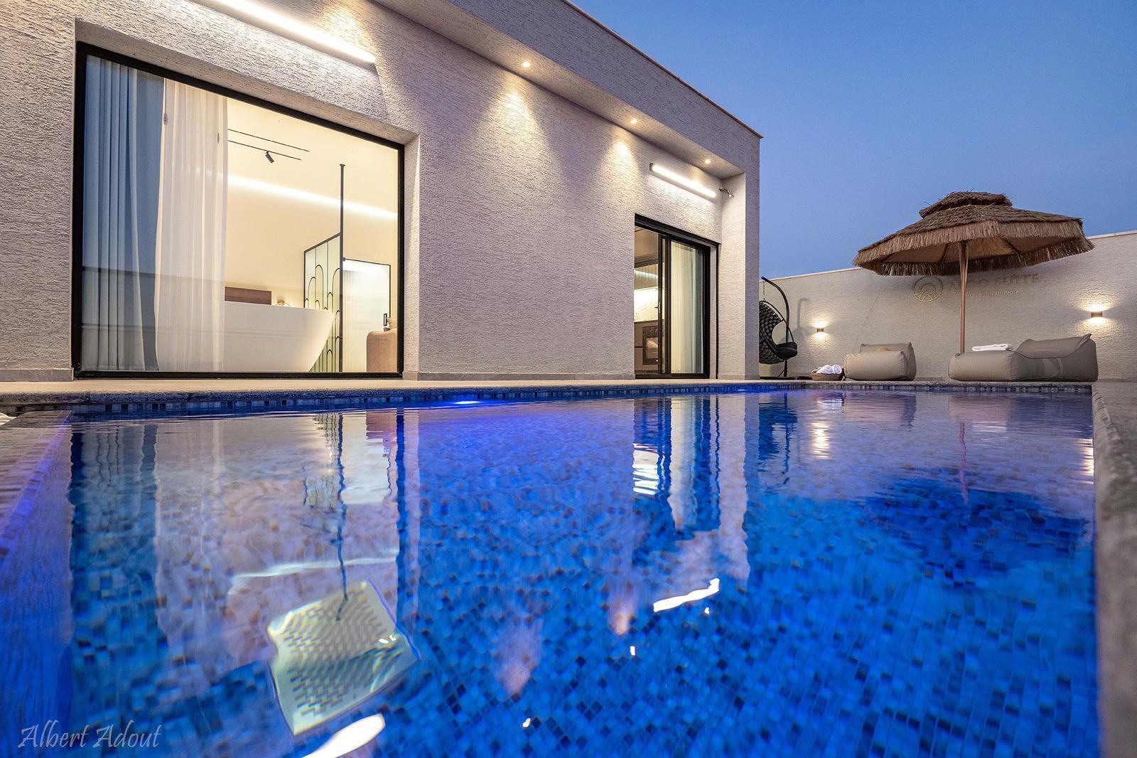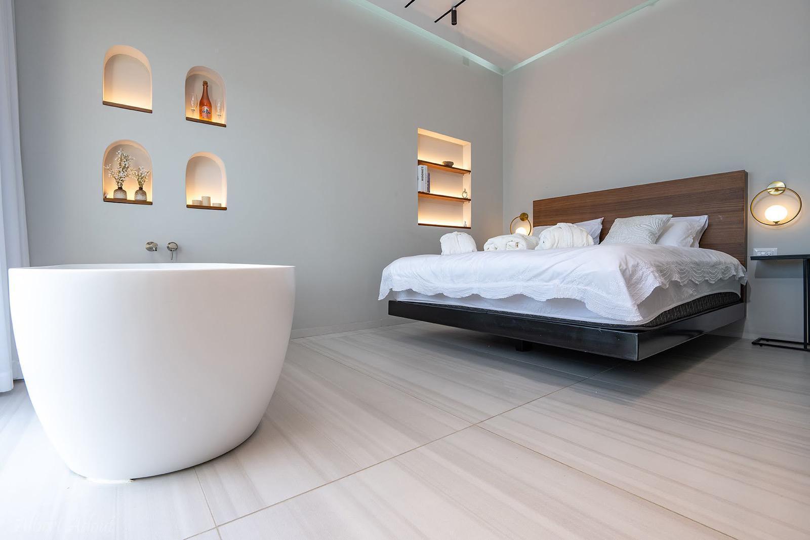 הסוויטה מעוצבת בקווים נקיים ורכים, עם קשתות שנותנות תחושה הרמונית ונעימה. המיטה הצפה מוסיפה טאץ' מודרני ומיוחד, והאמבט שממוקם מול הבריכה יוצר חוויה מפנקת ורגועה. הגומחות בקירות לא רק יפות, אלא גם מוסיפות עומק ועיצוב מעניין, והמשרבייה משתלבת ומוסיפה לאווירה. כל זה יוצר חלל שנעים להיות בו, עם חיבור טבעי בין הפנים לחוץ