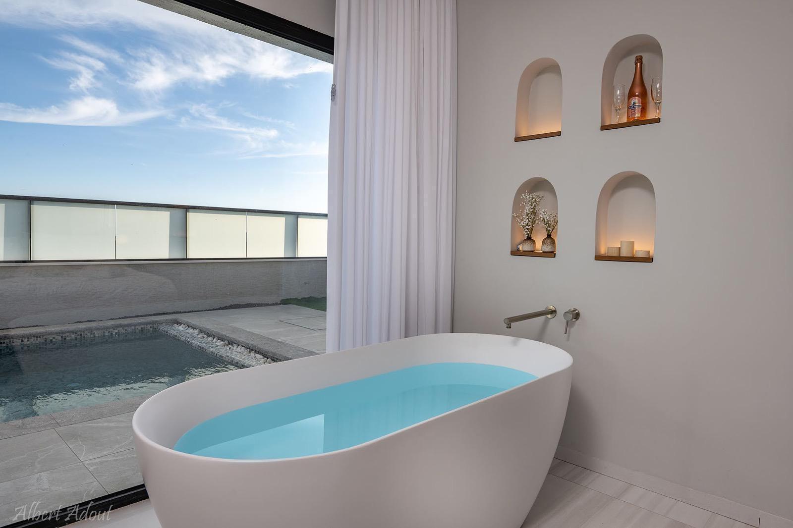 את האמבט הפריסטנד שממוקם בסמוך לחלון הצופה לבריכה – מושלם לרגעים של שלווה