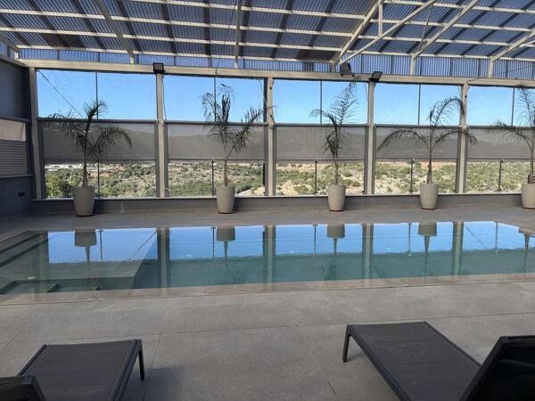 בחוץ מחכה לכם בריכה ענקית עם קירוי חשמלי ווילונות צד, ג'קוזי ספא, שולחן סנוקר, שולחן פינג פונג, מיטות שיזוף ופינות ישיבה. יש גם מטבח חוץ עם מקרר, מקפיא ומנגל פחמים אך בלי כיור.