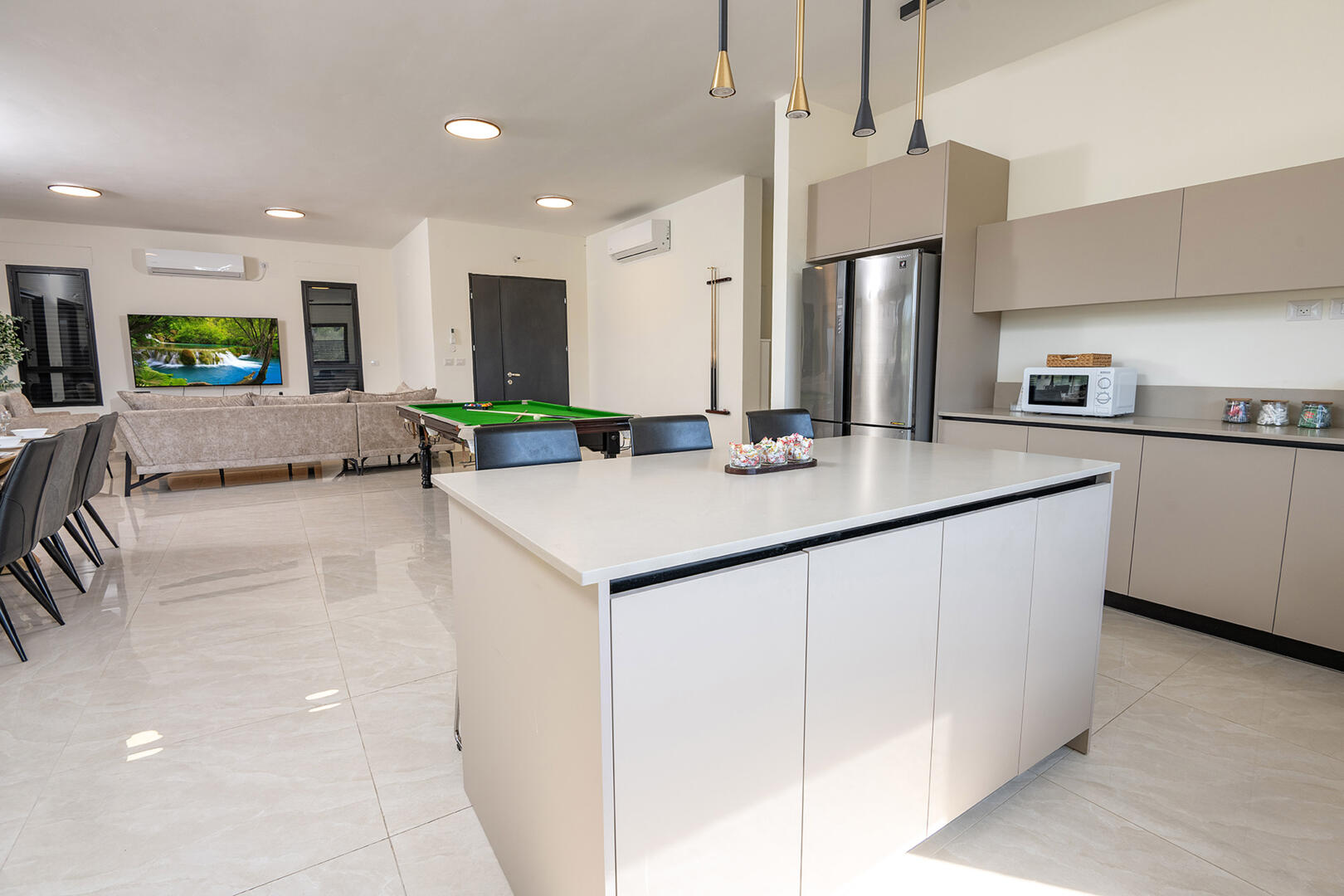מהרגע שנכנסים לוילה יש תחושה של בועה פרטית ונינוחה. הסלון המואר עם הווילונות הלבנים, השולחן הגדול שמזמין ארוחות משותפות, והבריכה שנפתחת לנוף – כל אלה יוצרים אווירה רגועה, כיפית ומשפחתית. העיצוב החמים מאפשר להרגיש בבית מהרגע הראשון, ולהיכנס ישר לסטייט אוף מיינד של חופשה.