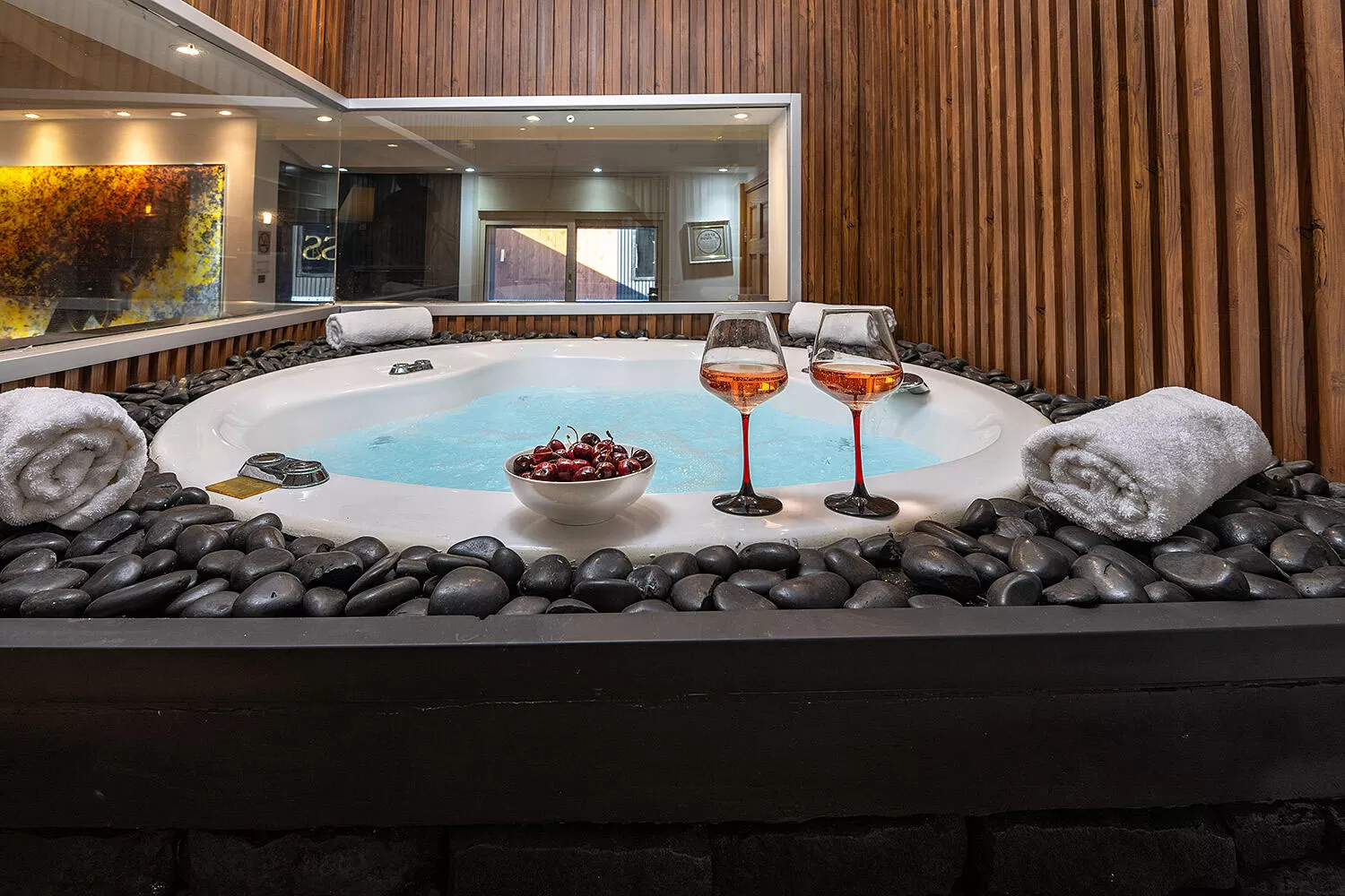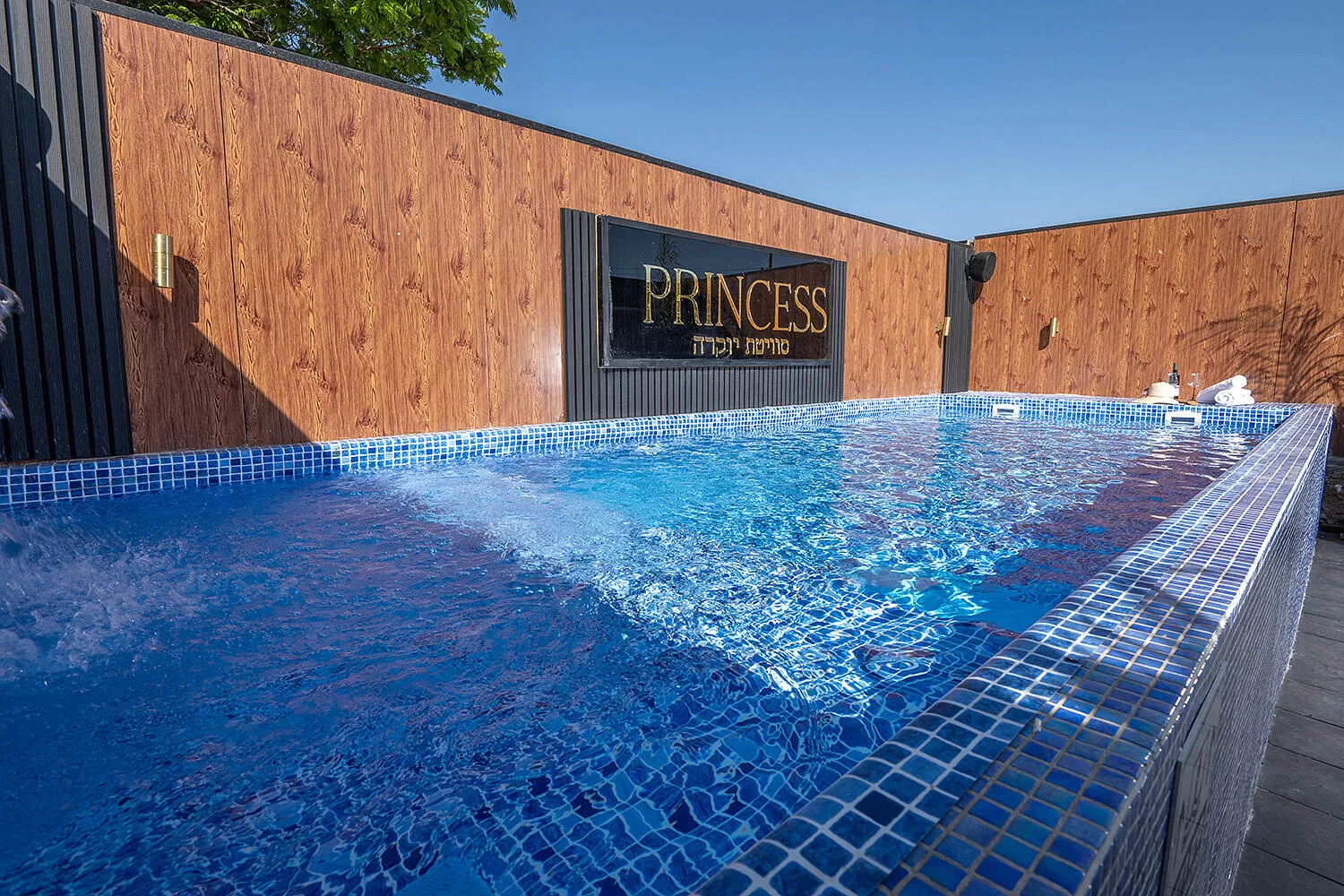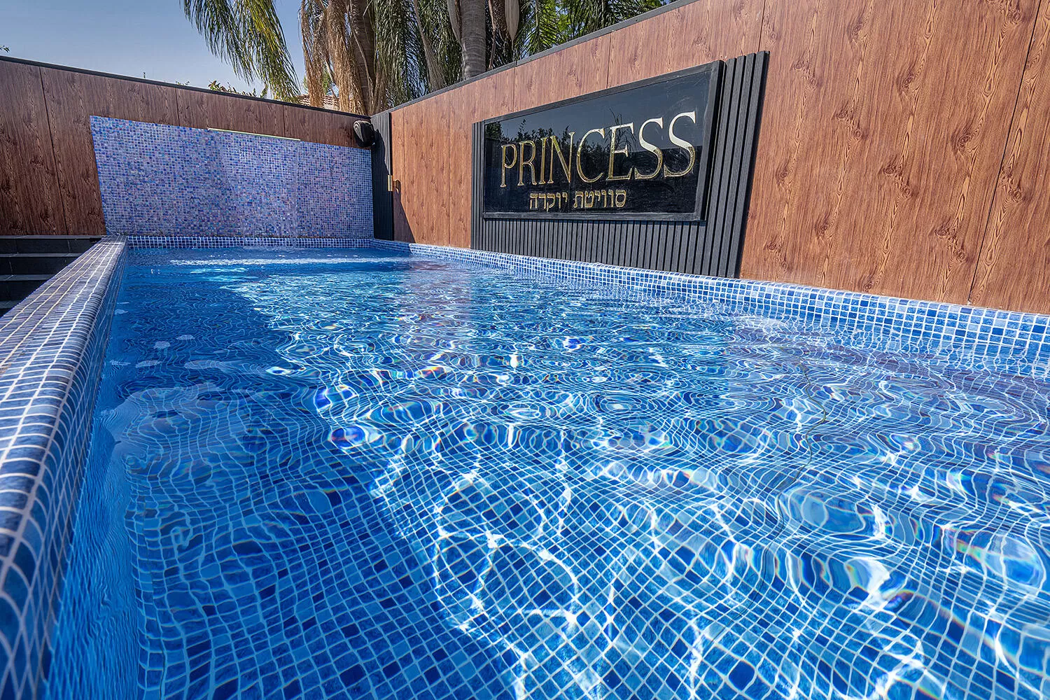 הבריכה הפרטית צמודה לסוויטה, מחוממת ומקורה בחודשי החורף וכוללת מערכת סאונד, טלוויזיה חיצונית ומשטח לשכשוך ורביצה – תחומה היטב לפרטיות מלאה.