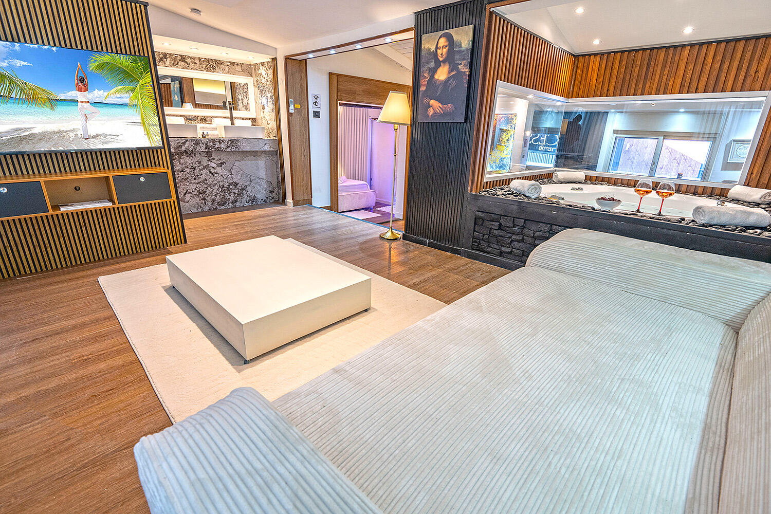 הסוויטה מרגישה כמו עולם קטן וסגור משלכם – שקטה, אלגנטית ותחומה היטב מהסביבה. התאורה הרכה, מערכת הסאונד והמעבר הישיר מהחלל הפנימי לבריכה – יוצרים יחד אווירה נעימה, אינטימית ומוקפדת