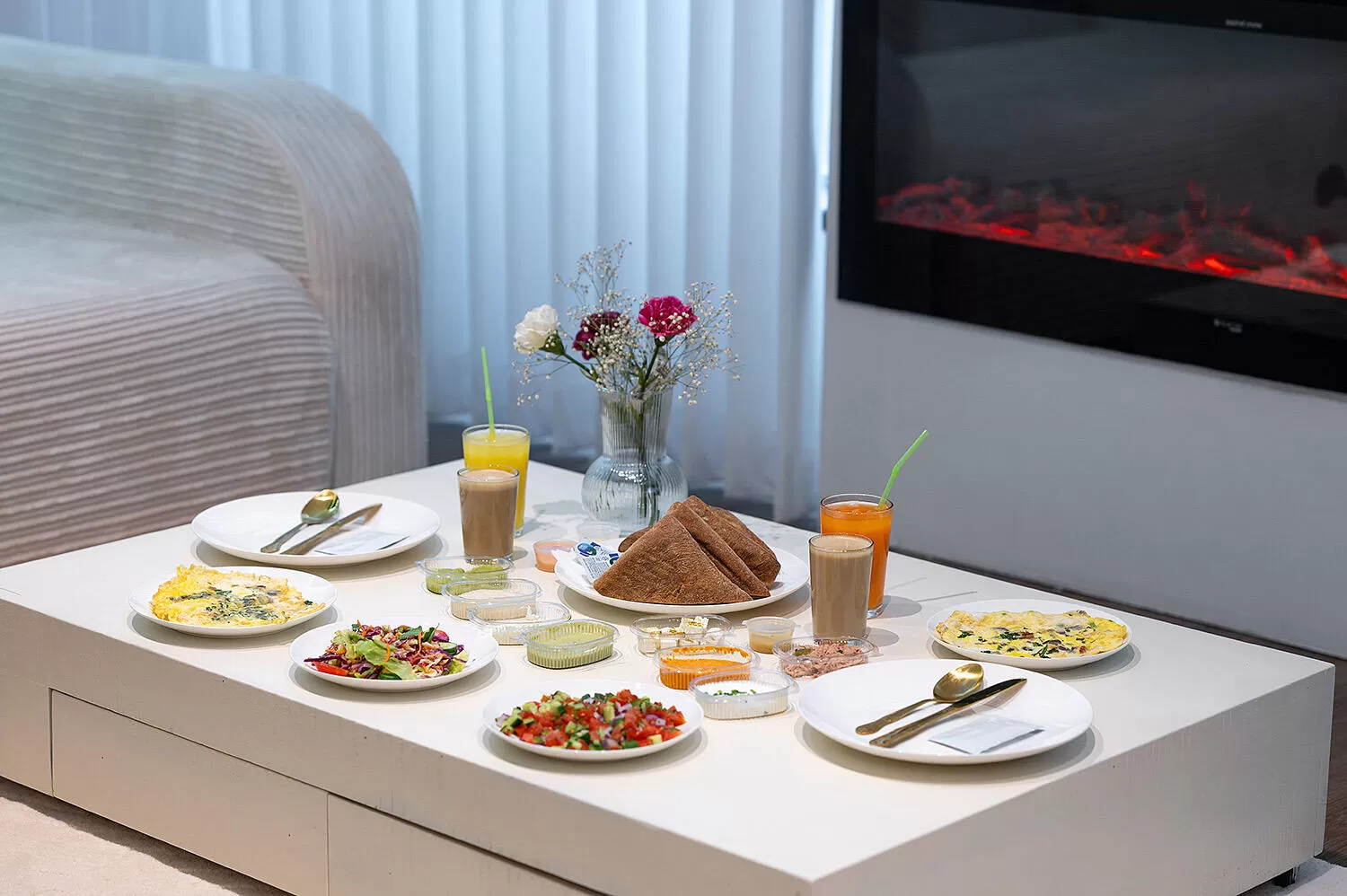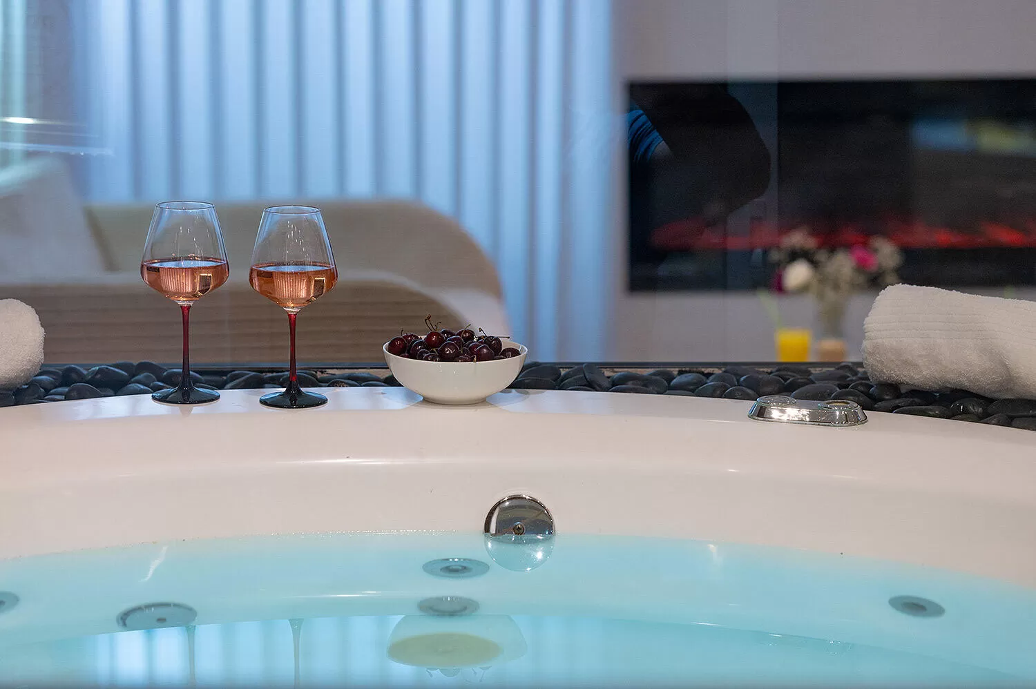 הסוויטה כוללת מיטה זוגית רחבה עם מזרן איכותי, ג'קוזי עגול ממש ליד המיטה, קמין חשמלי, טלוויזיה חכמה ופינת ישיבה נעימה. המטבחון כולל מכונת קפה טוחנת, מקרר, מיקרוגל וכלי בישול (מתאים לבישול קל במתחם החוץ בלבד) וחדר רחצה מרווח עם שני כיורים ואמבט