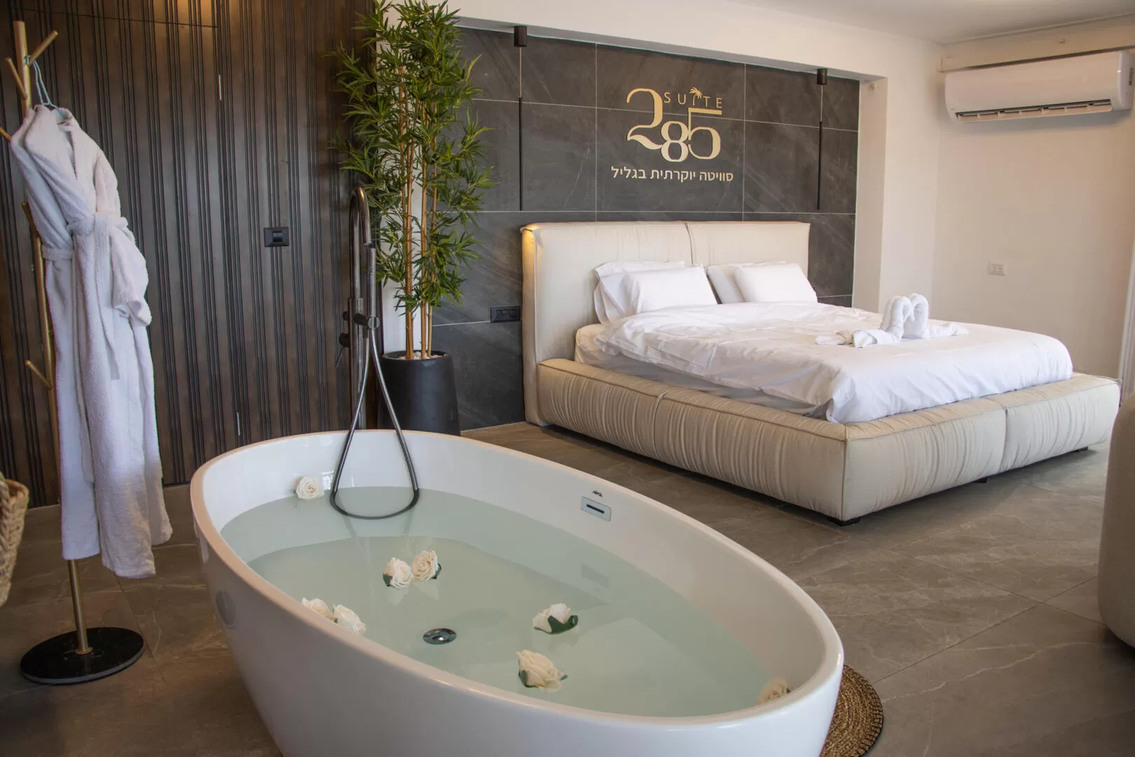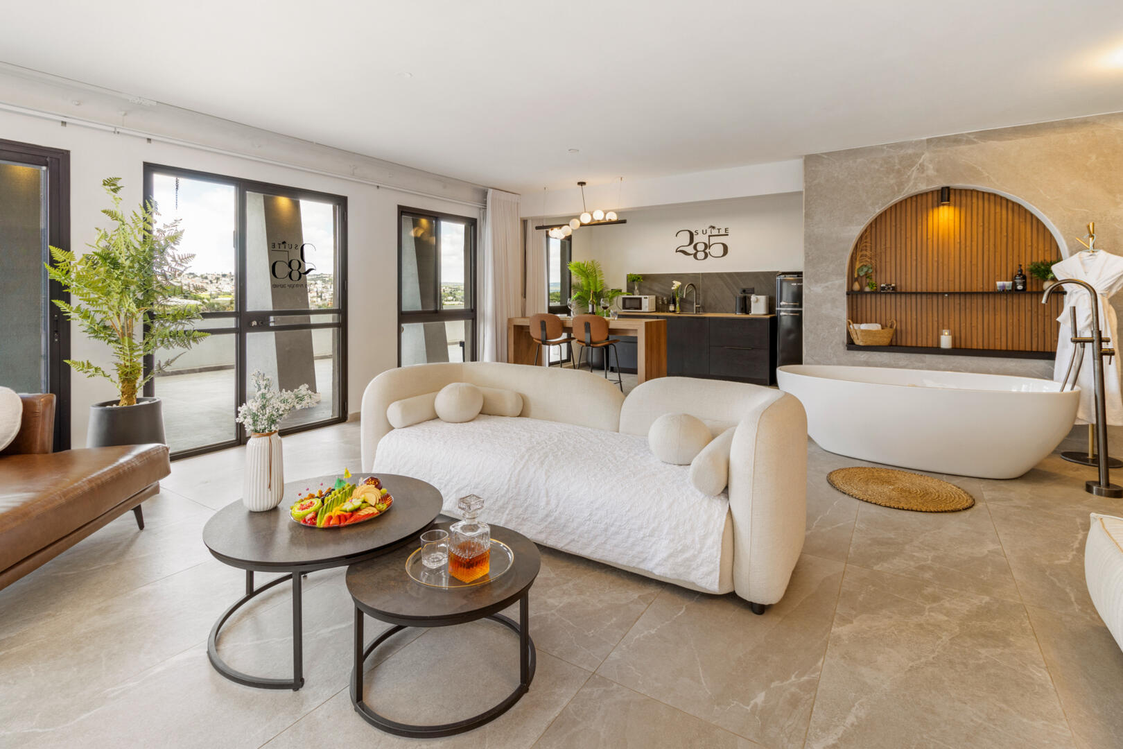 האווירה כאן מדויקת כמו העיצוב – שיקית, מוקפדת ומרגיעה. כבר מהכניסה מורגשת האסתטיקה שמובילה את החוויה – פינות הישיבה המעוצבות בחוץ, חדר השינה עם הווייב של סוויטת בוטיק אלגנטית, והאמבט ה-stand alone שמכניס רומנטיקה וסגנון לחלל. הכול מרגיש מתוכנן עד הפרט האחרון, בלי להרגיש מתאמץ.