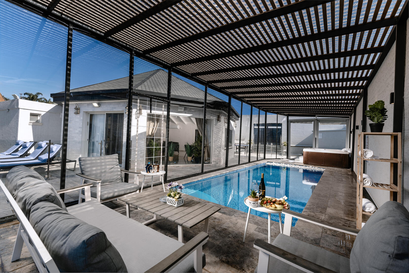 את הבריכה הפרטית מול הנוף, עם ג'קוזי ופינות ישיבה נעימות