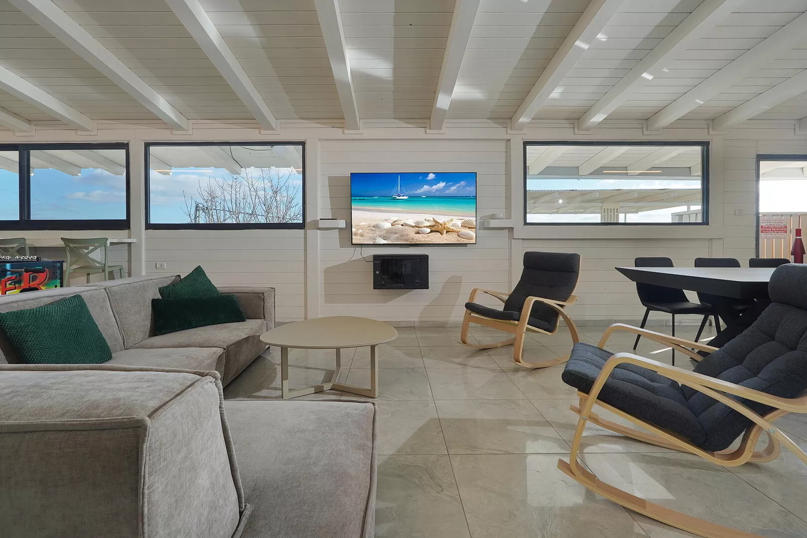 בפנים הוילה 4 חדרי שינה זוגיים – שני חדרים עם מיטת קינג סייז (180 ס״מ) ושני חדרים עם מיטת קווין סייז (160 ס״מ), בכל אחד חדר רחצה צמוד עם מקלחון. החדרים מסודרים בשורה וצמודים לאזור המרכזי בו סלון עם ספת שזלונג בגדול 2X3 וטלוויזיה חכמה, שולחן פינג פונג וכדורגל שולחן, פינת אוכל נפתחת ומטבח מאובזר עם כל הדרוש לבישול.
