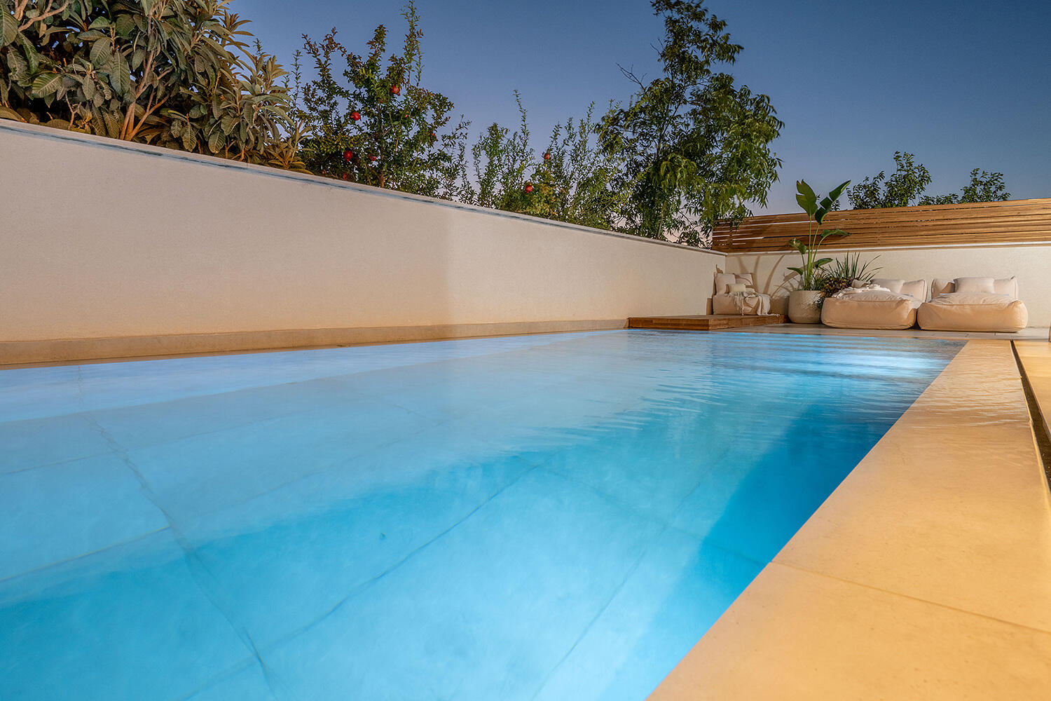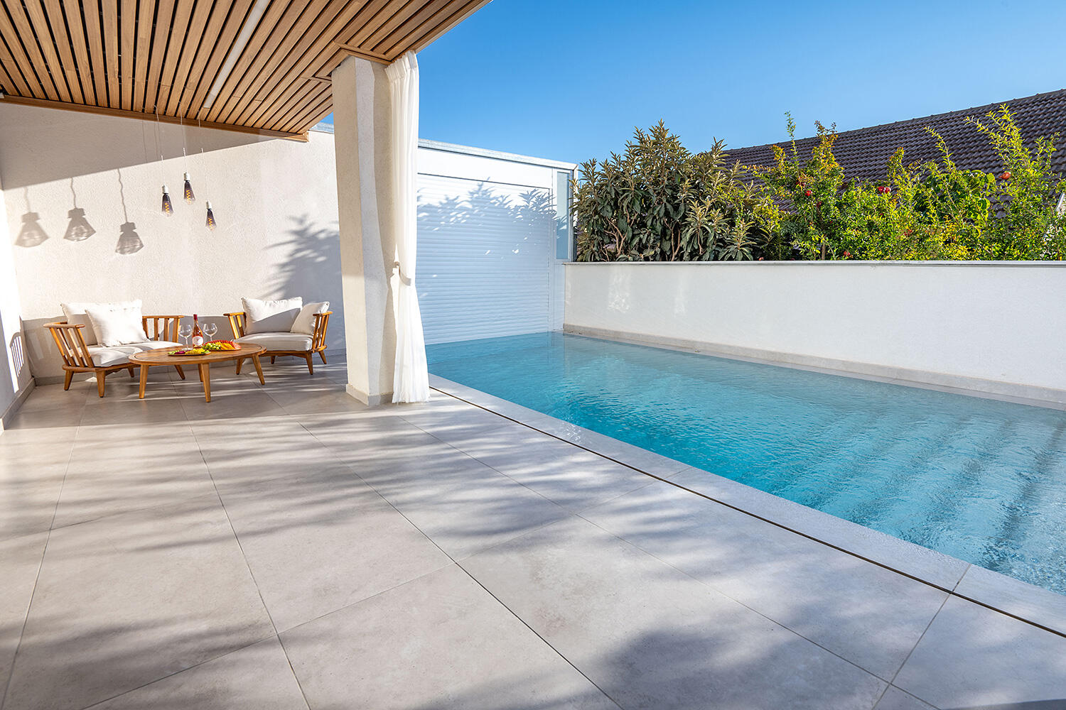 העיצוב כאן בקו נקי, מינימליסטי וזורם – הרבה לבן, תאורה רכה, אבן בזלת כהה ואור טבעי שמציף את החלל. הבריכה הכחולה נוכחת כל הזמן דרך הוויטרינה ויוצרת תחושה רגועה ושלווה. זה מקום שנבנה עבור זוגות בלבד, כאלו שמחפשים חופשה איכותית, אסתטית, שקטה ומדויקת.
