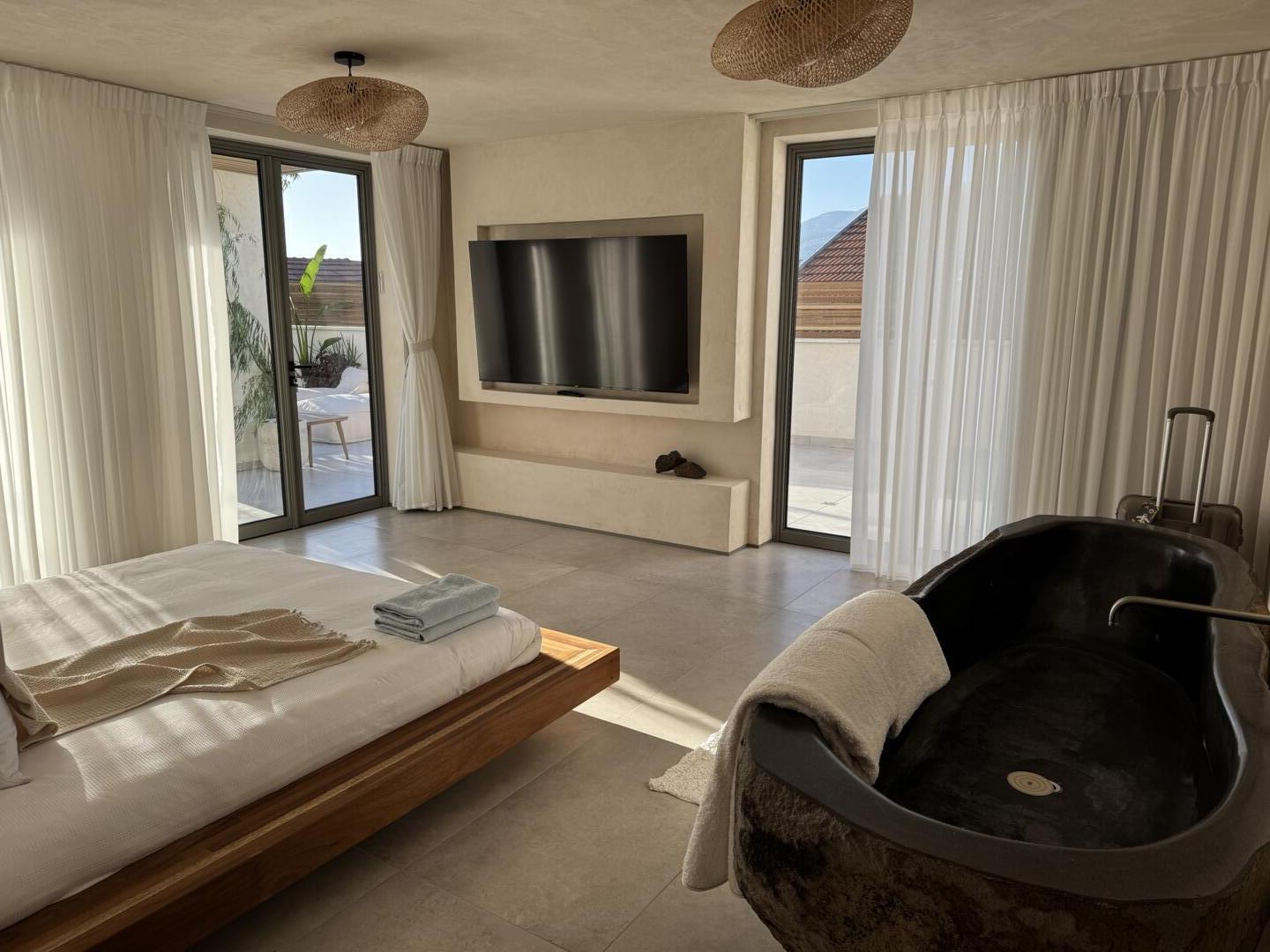 בכל סוויטה מיטה זוגית רחבה (180 ס"מ) עם טלוויזיה חכמה מולה, אמבט בזלת, מקלחון זוגי מפנק, ארון בגדים, חלוקי רחצה ותמרוקים.