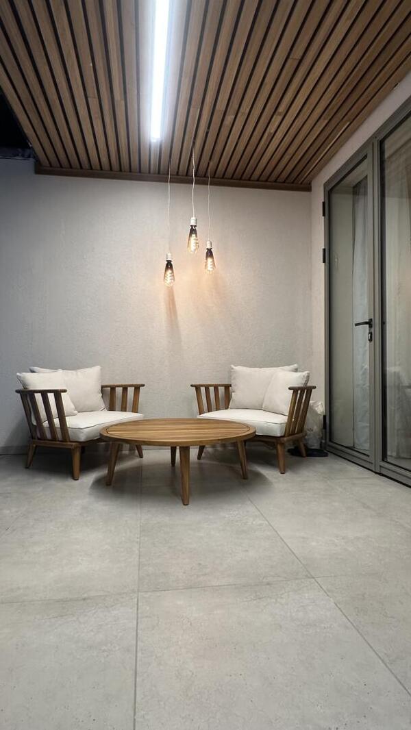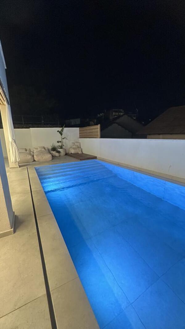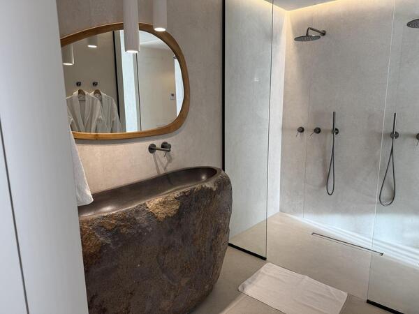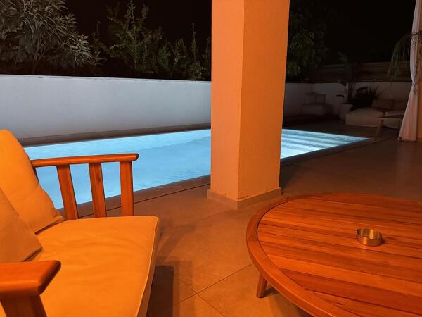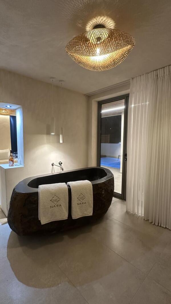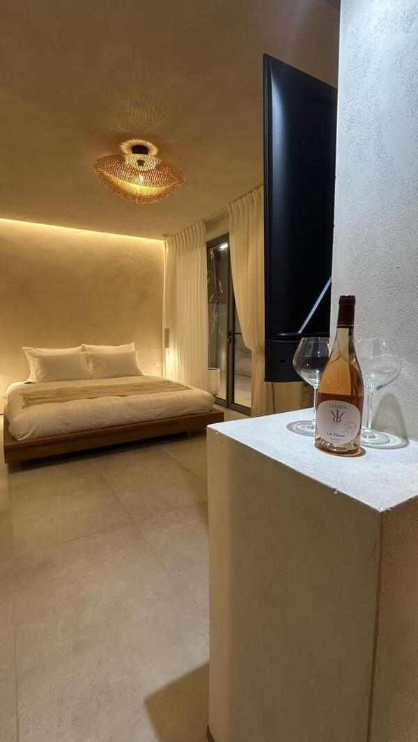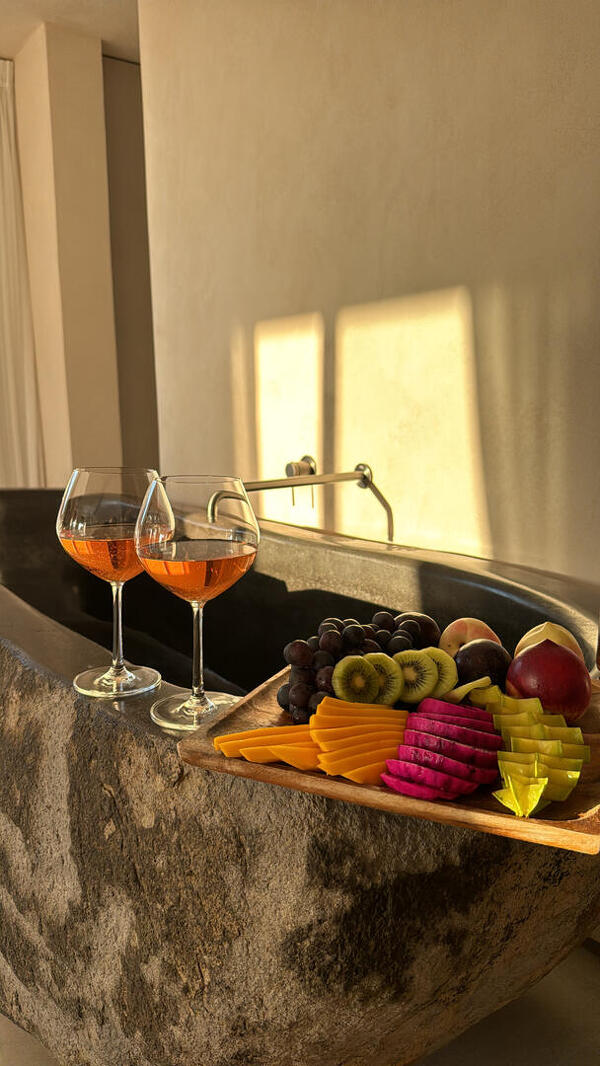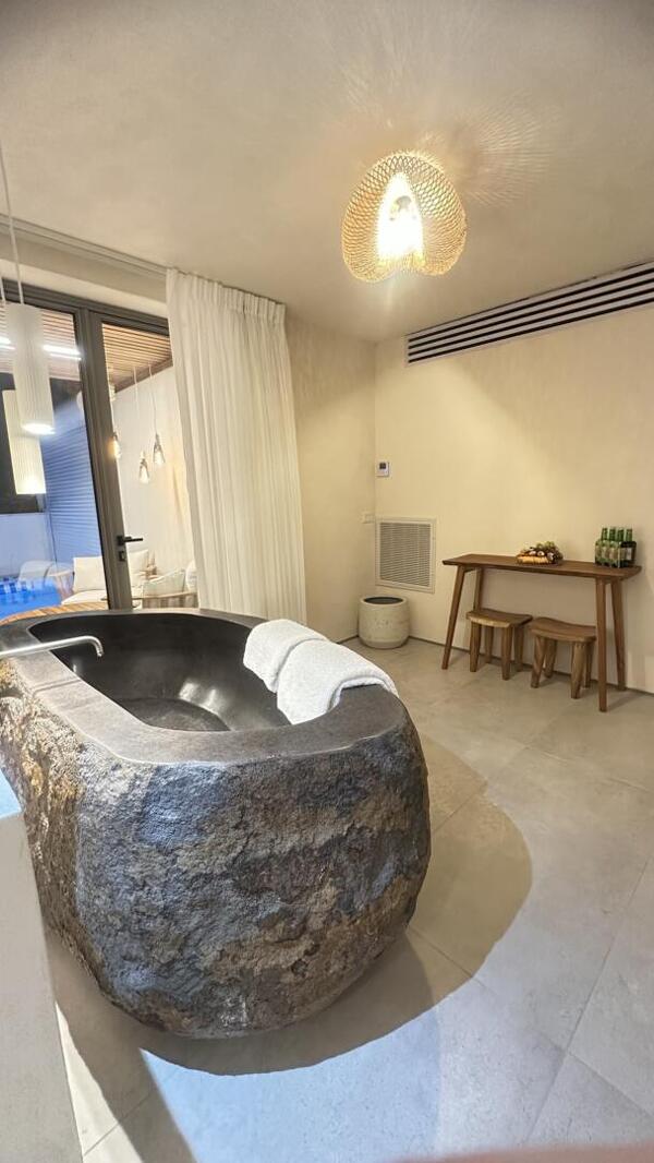 העיצוב כאן בקו נקי, מינימליסטי וזורם – הרבה לבן, תאורה רכה, אבן בזלת כהה ואור טבעי שמציף את החלל. הבריכה הכחולה נוכחת כל הזמן דרך הוויטרינה ויוצרת תחושה רגועה ושלווה. זה מקום שנבנה עבור זוגות בלבד, כאלו שמחפשים חופשה איכותית, אסתטית, שקטה ומדויקת.