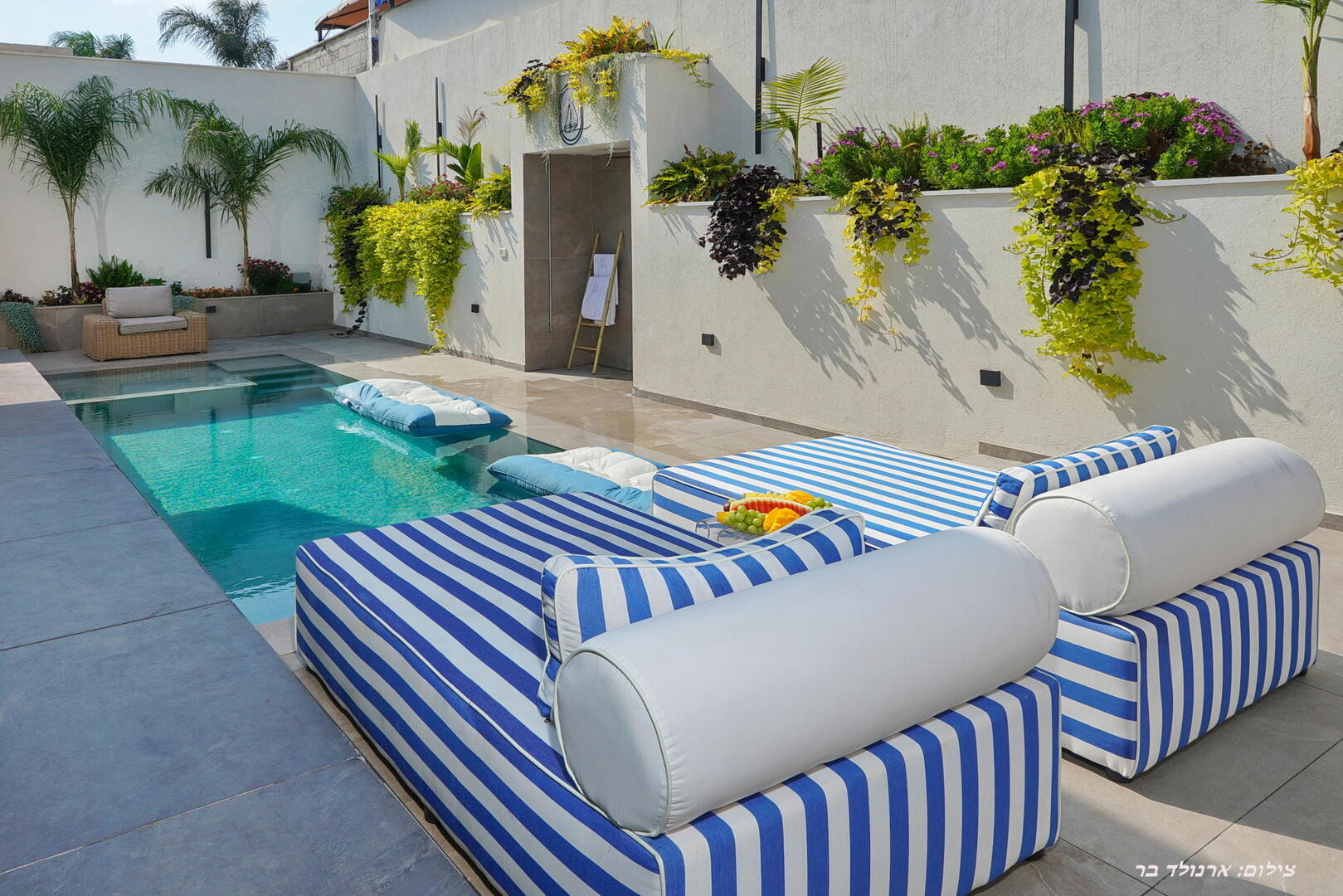 ברגע שנכנסים בשער הכניסה המרשים מגלים חצר פרטית לחלוטין עם בריכת שחייה מחוממת, ג’קוזי ספא גדול המעוצב כסירת מירוץ (!) ופינות ישיבה מעוצבות עם קמין חשמלי ופינת ישיבה מרווחת ומקורה עם טלויזה גדולה בצידי הבריכה.