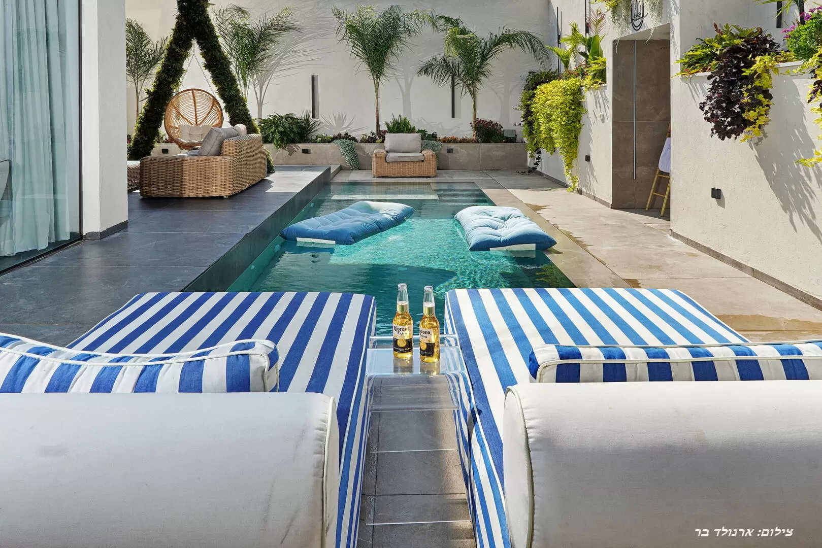 ברגע שנכנסים בשער הכניסה המרשים מגלים חצר פרטית לחלוטין עם בריכת שחייה מחוממת, ג’קוזי ספא גדול המעוצב כסירת מירוץ (!) ופינות ישיבה מעוצבות עם קמין חשמלי ופינת ישיבה מרווחת ומקורה עם טלויזה גדולה בצידי הבריכה.