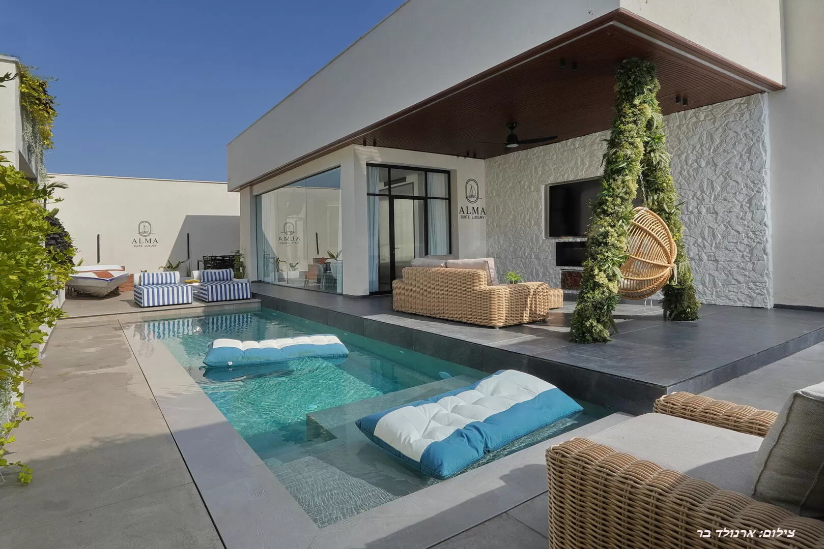 בפנים מחכה חלל גדול מעוצב בגוונים בהירים, עם אמבט Stand Alone המשקיף לבריכה, מיטת קינג מפנקת, פינת ישיבה זוגית וחדר רחצה מעוצב עם מקלחון. בחוץ תמצאו מקלחת חוץ עם פרטיות מלאה, ערסל ישיבה, מטבח חוץ מאובזר ופינות ישיבה נוחות, מיטות שיזוף, נדנדות ועוד.