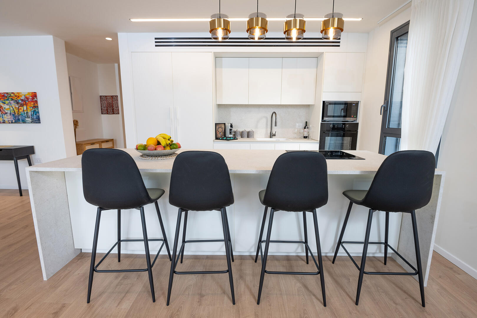 הדירה משתרעת על פני כ־160 מ"ר ומרגישה כמו בית חופשה אמיתי ליד הים. במרכז החלל תמצאו סלון מרווח עם טלוויזיה גדולה ופינת אוכל שמתאימה לשמונה סועדים, ובצמוד אליהם מטבח מאובזר שמאפשר לבשל ארוחות בקלות – כולל תנור, כיריים אינדוקציה, מדיח ובר מים.