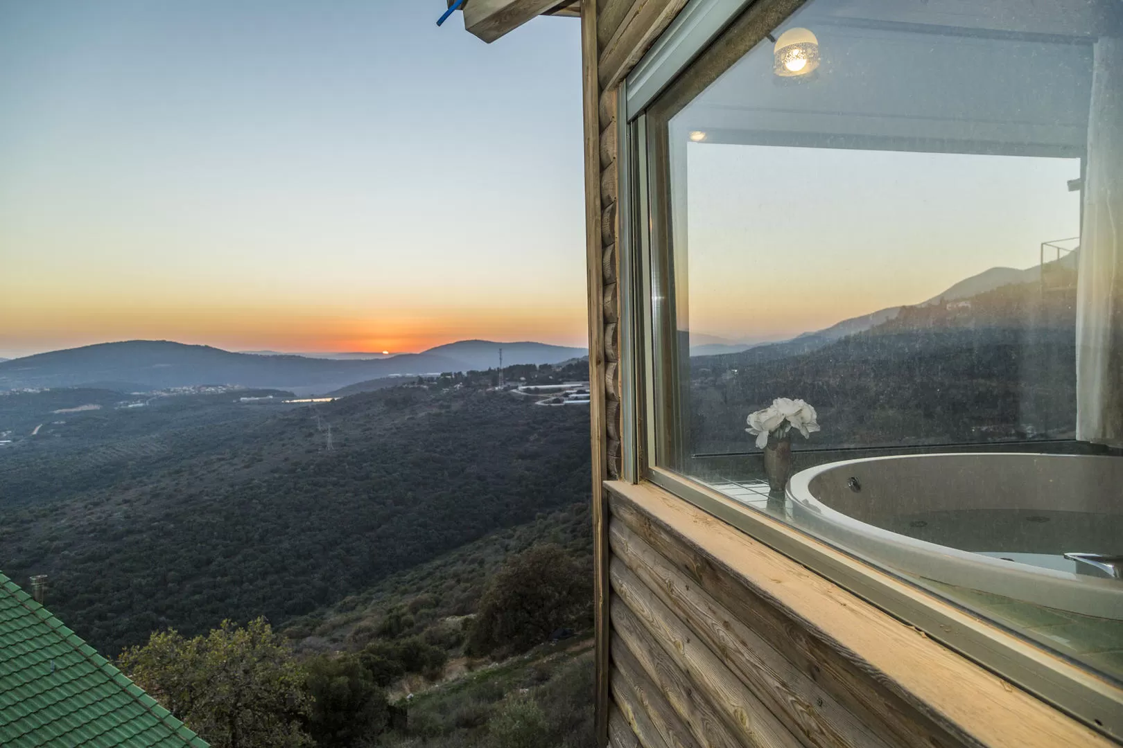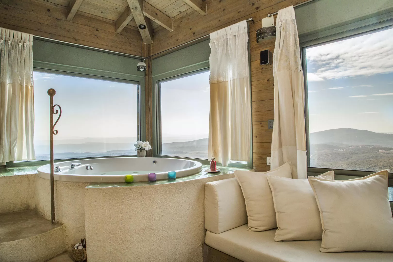 התכנון החכם מיקם את הג'קוזי בפינה, כמו תמונה: בין שני חלונות צרפתיים, הצופים ממעוף הציפור לעבר נוף מהמם של כנרת והרים. תריסים חשמליים מעניקים פרטיות אם צריך, ונישה בקיר מארחת כלי נוי עדינים.