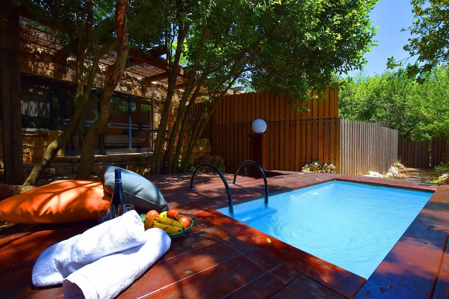 הוילה עצמה מאוד בייתית והעיצוב החמים מסביר כי פעם גרה כאן משפחה אוהבת ובעלת טעם טוב. הגינה מסביב קסומה, עם שבילי אבן וצמחייה מאושרת - יצחק הבעלים הוא אומן שגם מנגן על עוד וגם מתמחה בבנייה ופסיפס - ובאמת אי אפשר לפספס את זה בכל המתחם. כשנכנסים לחצר הווילה, מיד בצד ימין יש סאונה מעץ. מנגד ישנה עמדת BBQ, רחבת דשא סינתטי, וצמוד לבית צמחייה נאה ושבילי אבן במראה טבעי. בכדי לגשת לבריכה יש לעלות על מדרגות עץ למתחם ה"דק". הבריכה מסוג אינטקס, ויש גם פינת ישיבה.