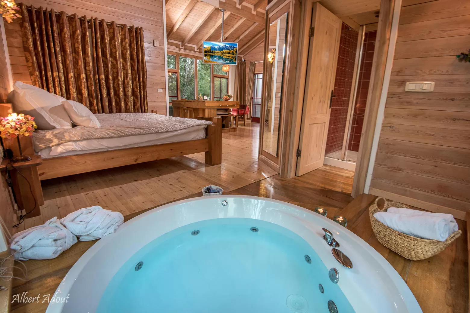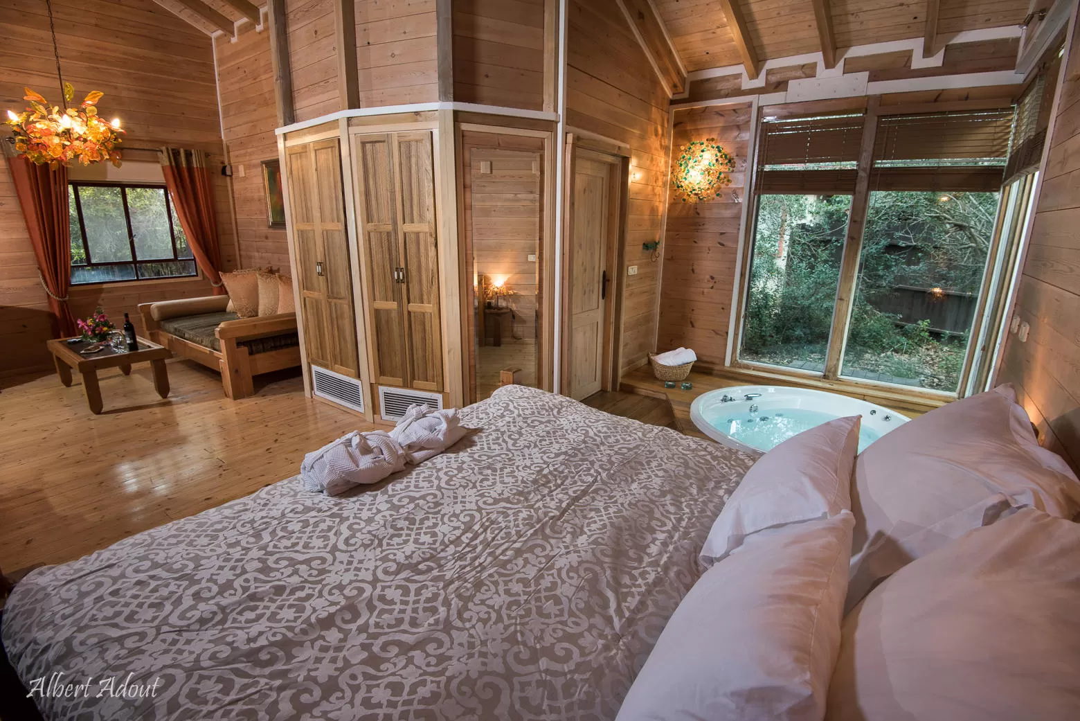 "אי" מדהים ביופיו העשוי עץ נמצא במרכז הסוויטה ומכיל בתוכו את כל מה שצריך: משטח עבודה, כיור, ארונות, כיריים חשמליות ועוד. תמצאו עליו גם מגוון כיבודים. יש כאן מיטה זוגית ענקית (200/200), מסך פלזמה ענק עם מגוון חיבורים, ג'קוזי זוגי גדול היושב למרגלות קיר זכוכית הצופה אל החצר- בשעת הצורך יש גם וילון גלילה.