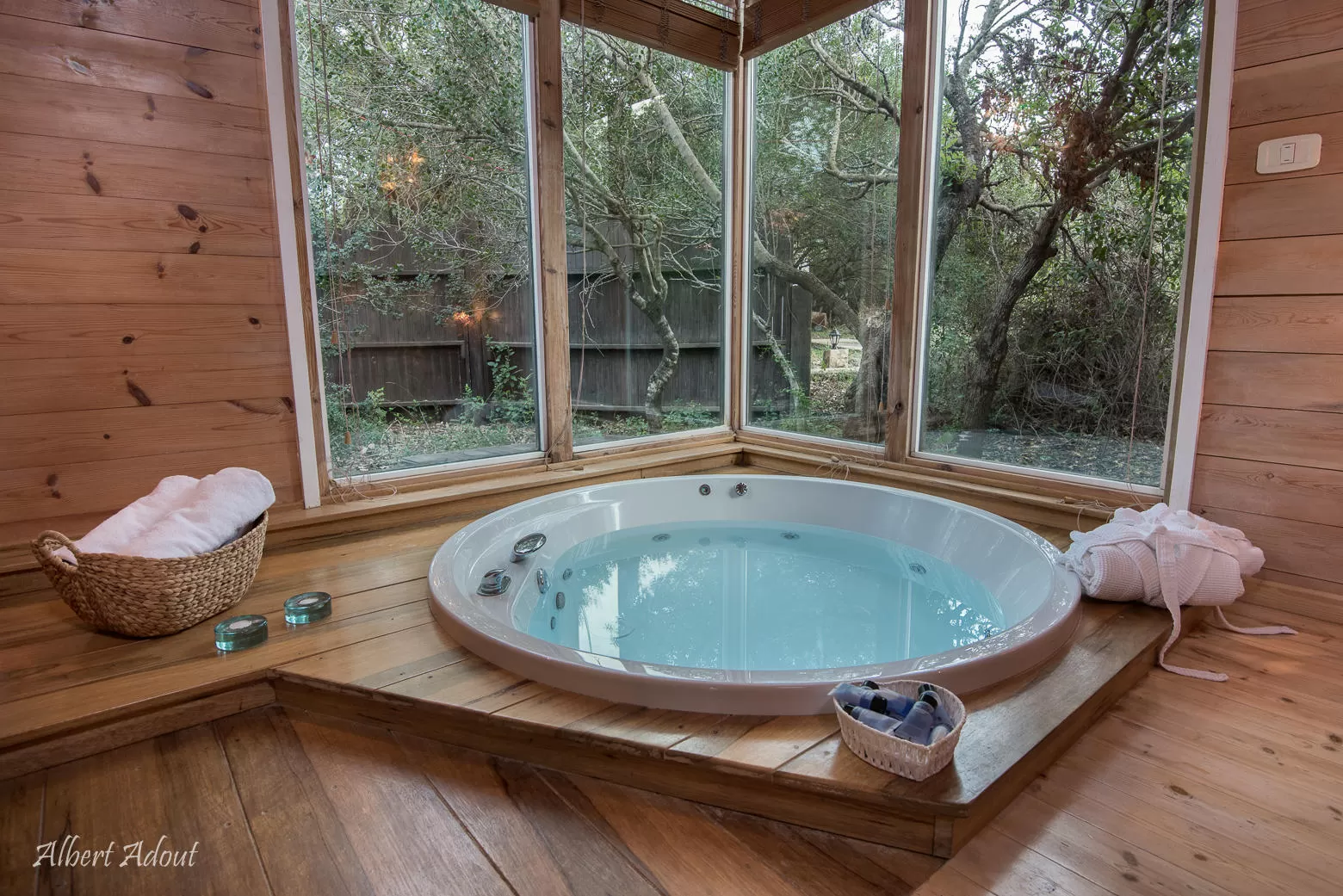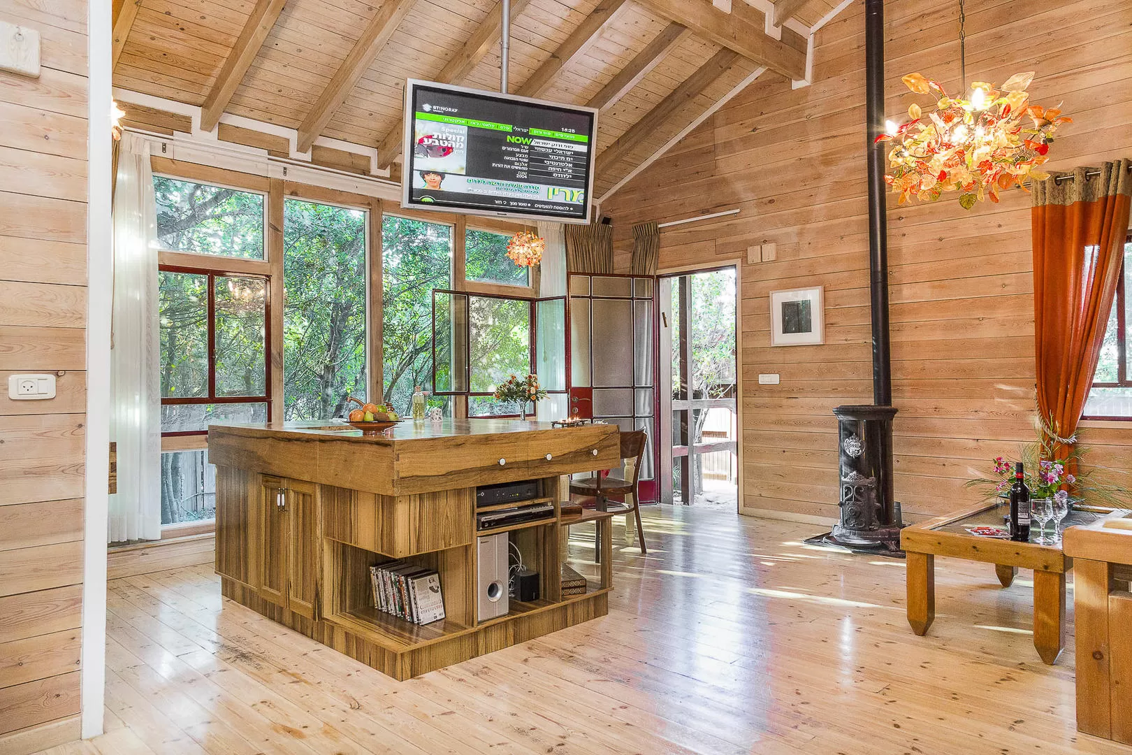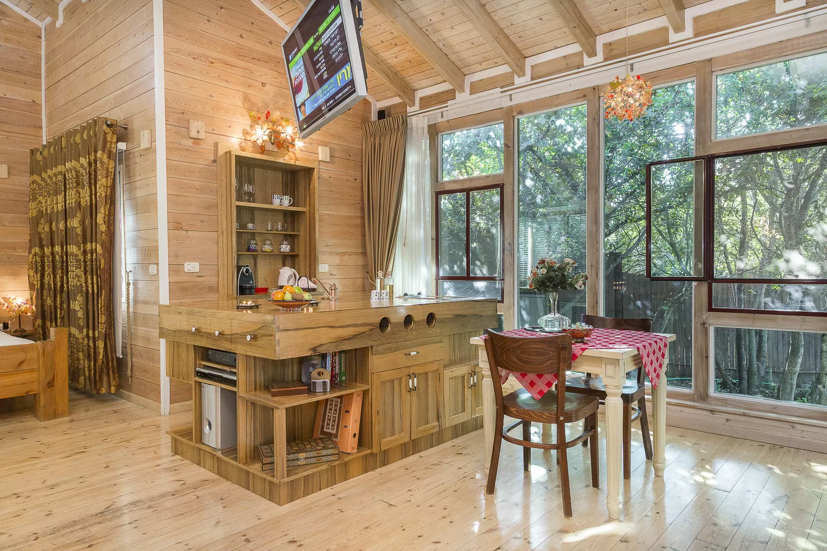 הסוויטה מציעה חלל גדול שתקרתו גבוהה מאוד הבנוי כולו מעץ- אבל לא סתם, אלא עם הרבה כבוד לחומר. אין כאן את התחושה ה"כבדה" שקיימת לפעמים בבקתות שכל כולן עץ. להיפך- החלל הגבוה נושם, מואר, נעים ומחבק. פינת אוכל אינטימית היושבת למרגלות קיר זכוכית מעניקה תחושה של לשבת ממש "בתוך" הגינה הקסומה.