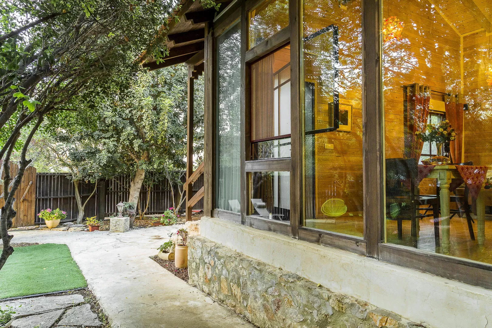 כבר בכניסה למתחם הזה ניתן להרגיש את האווירה ה"אחרת". אני מניח שזה משהו שקשור לאיכותם של המארחים ולאיך שבחרו לעצב, לבנות ולתחזק את המקום הנפלא הזה. הכניסה אל הסוויטה היא דרך חצר יפיפייה המתוחמת בגדר עץ גבוהה היוצרת את הפרטיות המלאה. בחצר מצאנו שתי מיטות שיזוף תחת עצי האלון ופינת ישיבה עם שולחן קטן המונחת על משטח אבן המעוטר בגינת נוי וצמחי תבלין.