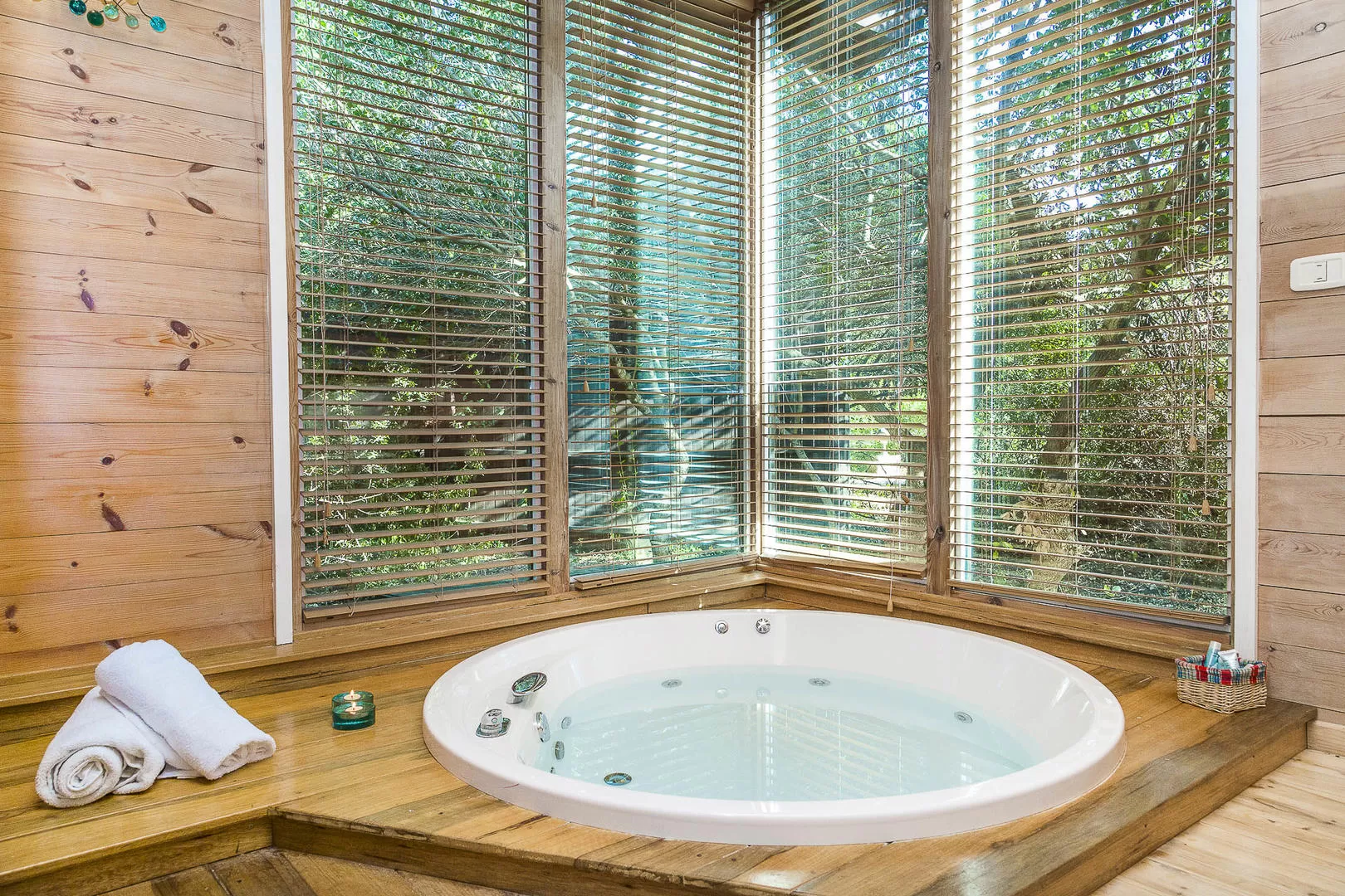 הסוויטה מציעה חלל גדול שתקרתו גבוהה מאוד הבנוי כולו מעץ- אבל לא סתם, אלא עם הרבה כבוד לחומר. אין כאן את התחושה ה"כבדה" שקיימת לפעמים בבקתות שכל כולן עץ. להיפך- החלל הגבוה נושם, מואר, נעים ומחבק. פינת אוכל אינטימית היושבת למרגלות קיר זכוכית מעניקה תחושה של לשבת ממש "בתוך" הגינה הקסומה.