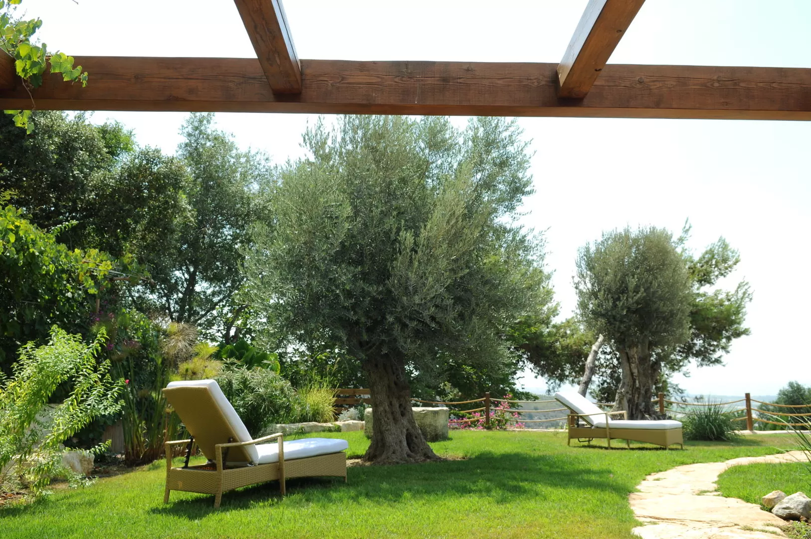 אנו פוסעים בשבילי הגישה המבתרים את הגינה הירוקה והשופעת. כמו כל דבר כאן, גם שילוב האבנים בשביל הוא ייחודי: שיבוץ של אבנים מקומיות גדולות וכדורי זכוכית קטנים מעטרים את הפרוסות הגדולות של האבנים המקומיות. מכיוון שהסוויטות ממוקמות בפאתי עין הוד, הנוף הירוק כמעט ואינו מופרע וגגות הבתים המעטים נמוכים בהרבה ממפלס הגינה כך ששום דבר לא עומד בין הצופה לבין מושא צפייתו- הנוף.