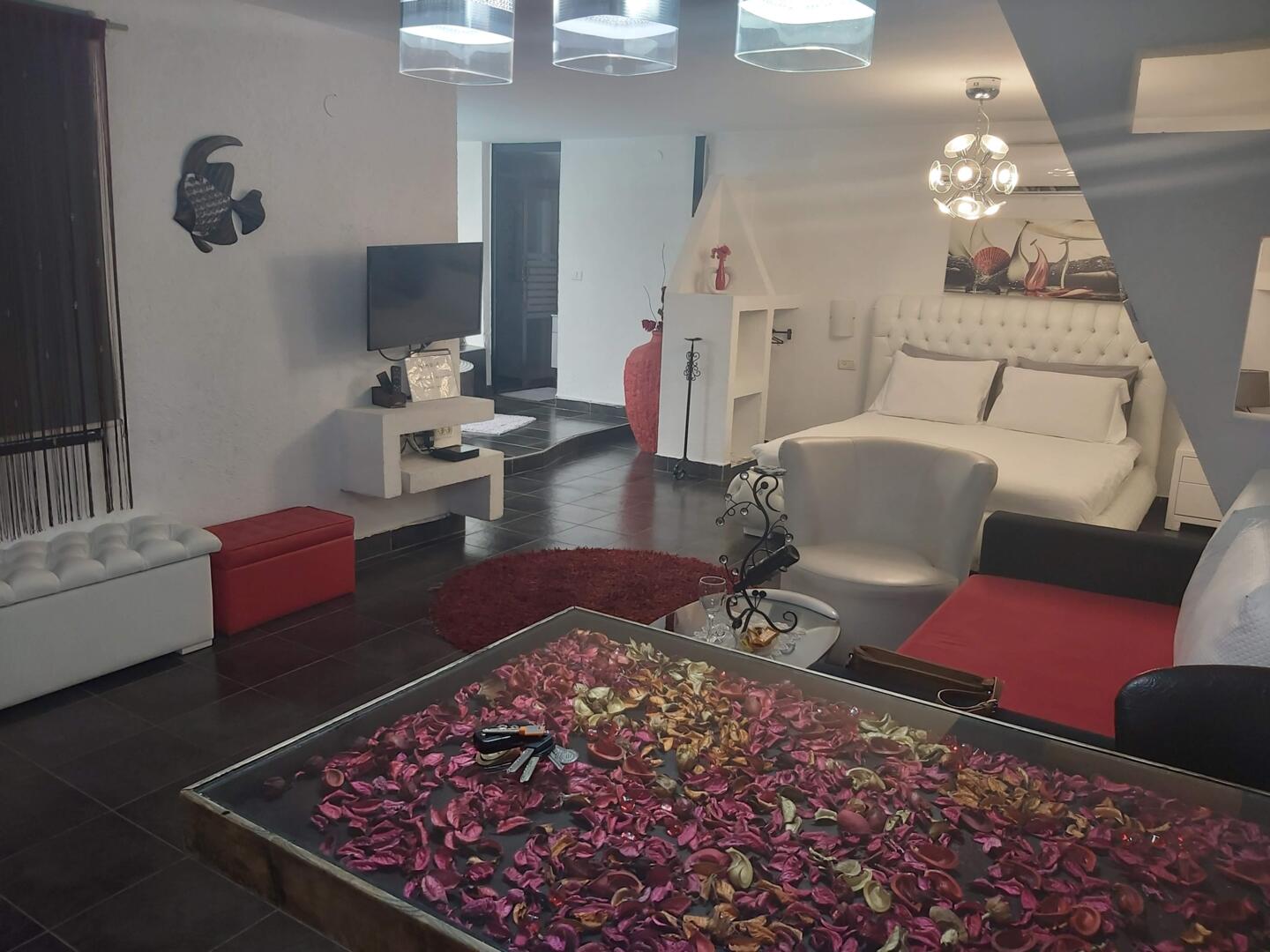 משמאל מחכה לכם ג'קוזי עגול ענק, המונח על פודיום המרוצף בפסיפס צבעוני, ובסמוך אליו - דלת הזזה עם יציאה לבריכה המרהיבה והמרווחת עם תאורה לילית קסומה... השהיה מאפשרת פרטיות מוחלטת. האווירה הקסומה והרומנטית מושגת בסוויטות על ידי שלל פרטי עיצוב נוספים - נרות שונים, גופי תאורה ייחודיים, שטיחונים פרוותיים, כדים ודקורציות על הקיר, מתקן מיוחד ליין - כל אלה נבחרו בקפידה רבה ומשתלבים יחד בהרמוניה מושלמת. מבנה החלל עשיר בנישות גבס, מפלסים והפרדות חלקיות ויוצרים אווירה אינטימית וחושנית.