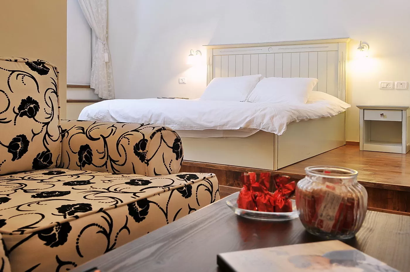 על במה מוגבהת שוכנת מיטה כפרית מאסיבית, ג'קוזי גדול במיוחד ממוקם בסמוך לחלון הצופה לנוף. קיר לבנים ייחודי הממוקם במרכז החלל מיועד לקמין ומוסיף "טאץ'" עיצובי מעניין.