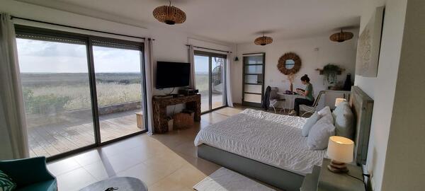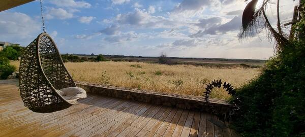 ג'ודי לוקחת אותי לסוויטה היחידה שבקומת הקרקע ואני פוגש שם לא מעט נגיעות עיצוביות שממשיכות בקו הזה של "בית-חוף". יש פה גופי תאורה אוריינטליים, ריהוט קל בגווני טורקיז נעימים, תמונות אווירה וכל מה שצריך בשביל להרגיש שאתם באמת לא במקום שגרתי. הסקה תת רצפתית (בימי החורף) מעניקה תחושה מושלמת. אני מוצא כאן גם מטבח לא שגרתי, חלבי- צמחוני, עם כיריים חשמליות, מצנם, מיקרוגל-אובן, שמן זית ותבלינים. אני יוצא החוצה אל "דק" עץ גדול, ומגלה ג'קוזי ספא מקורה להגנה מפני גשם בחורף, שלצידו קמין גז משוכלל. יש פה פרטיות מוחלטת ויש אחלה נוף אל גבעות הכורכר והים.