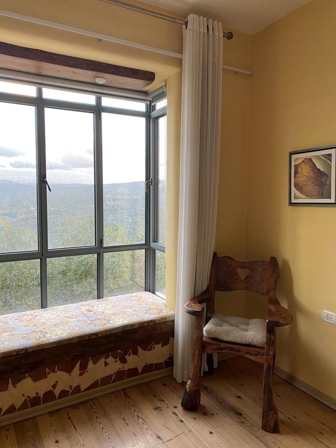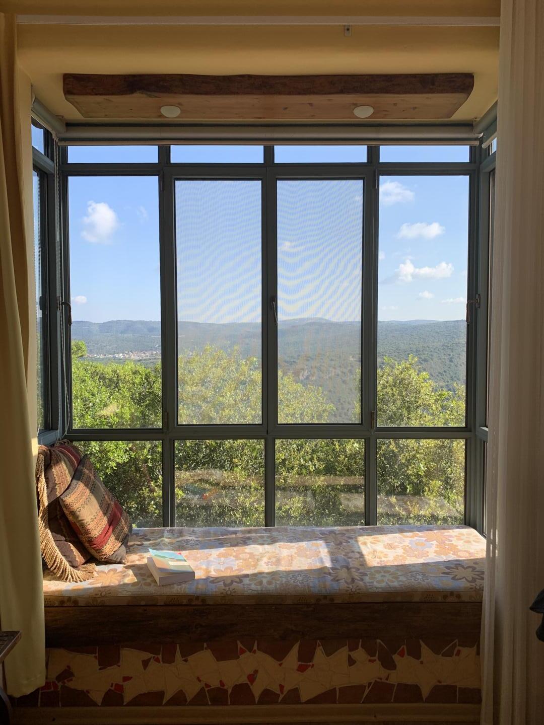 עוד דבר שיכול לעזור זה הגילוי שאיזמרגד יושב בקצה הישוב, על נחל כזיב עם נוף פסיכי למונפורט, לגליל ולעוד מלא מקומות שאתם לא מכירים. יואל, המארח, מוביל אותי לבית בגווני חמרה נעימים ומכניס אותי לחלל בגודל שנדיר למצוא בצימרים (70 מ"ר!). יואל מספר לי שזה הצימר היחיד שלהם ושהוא ממוקם מעל הבית. "איך מעל הבית?" אני מופתע: לא עליתי אפילו מדרגה אחת בדרך. מסתבר שהצימר הוא בגובה פני הרחוב, כך שבית המארחים מסתתר למטה במדרון ולא מורגש כלל.