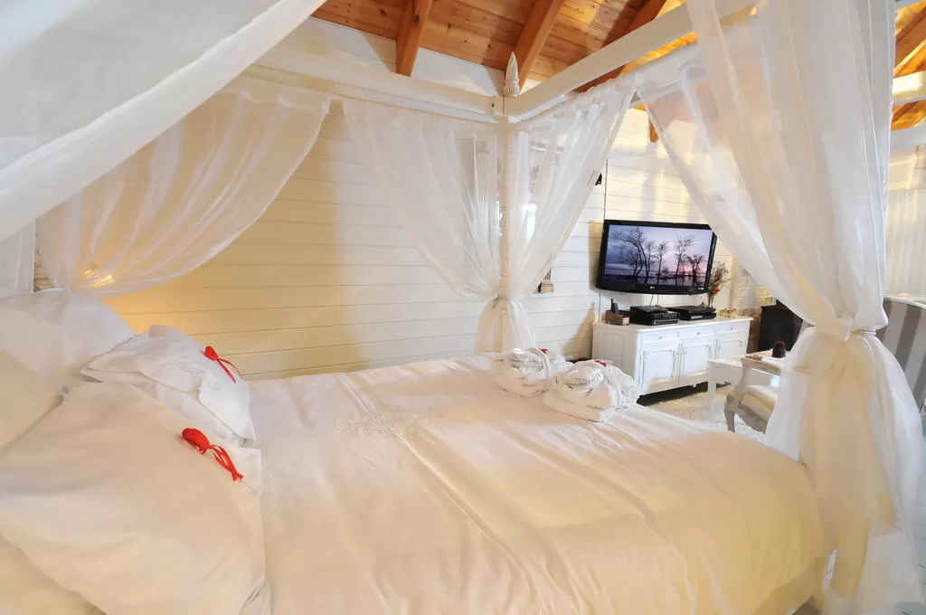 זה התחיל עם סיור במתחם המגונן ובשלוש הבקתות המטופחות. הן די קרובות אחת לשניה וגם לבית המארחים, אולם תכנון נבון וצמחיה מתאימה מאפשרים פרטיות. אין למתחם נוף מיוחד, אולם עושה רושם שהעיצוב הפנימי מפצה על כך היטב: סיור בבקתה מגלה חלל אחד צבוע בגווני שמנת, רצפת עץ בהירה ותקרה גבוהה, אבל העניין הוא העיצוב. "איך הצלחת לשכנע את ארמון ורסאי לתת לך רהיטים?" אני שואל את אנט למראה מיטות אפריון ופינות ישיבה בסגנון עתיק.
