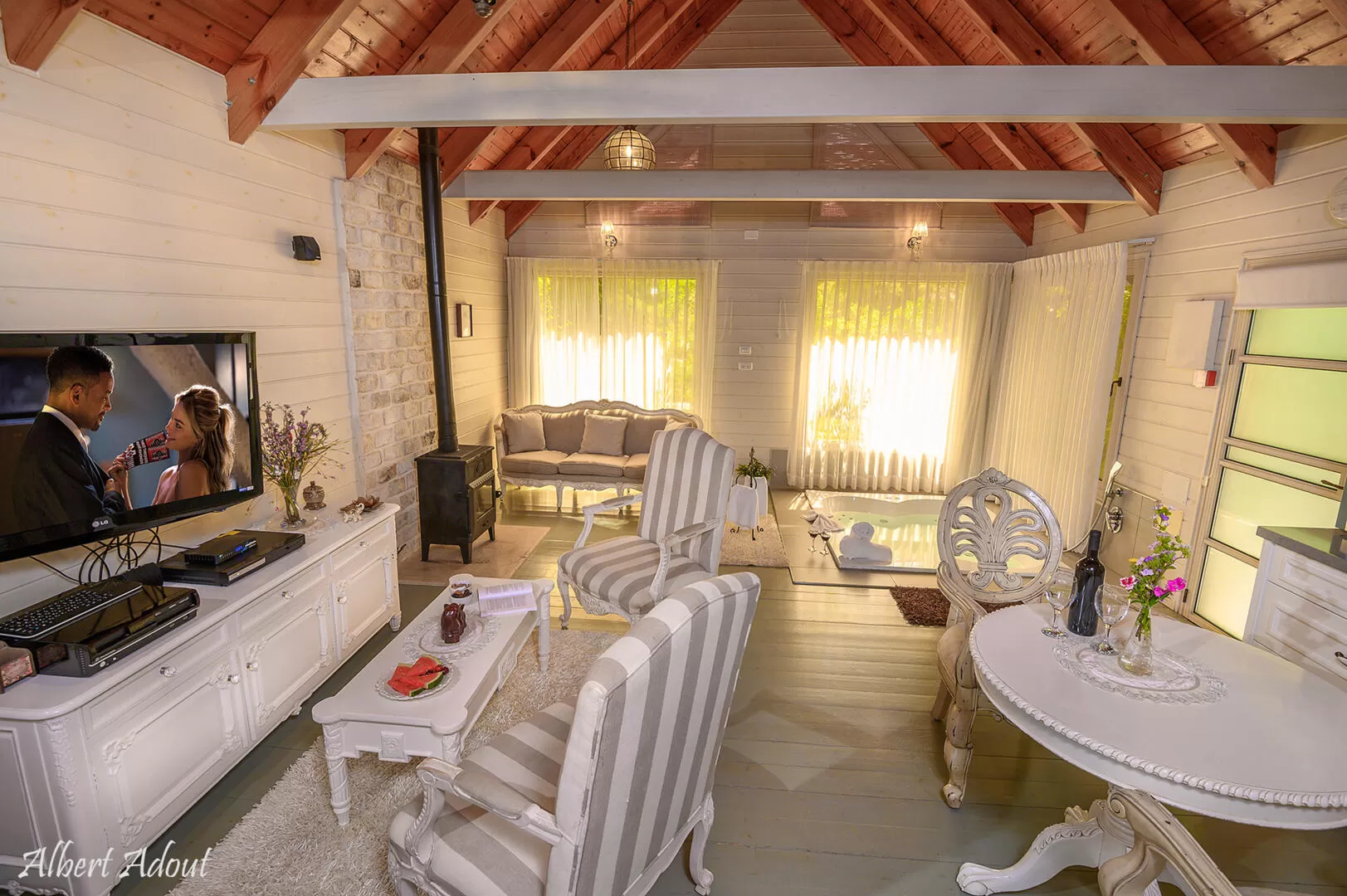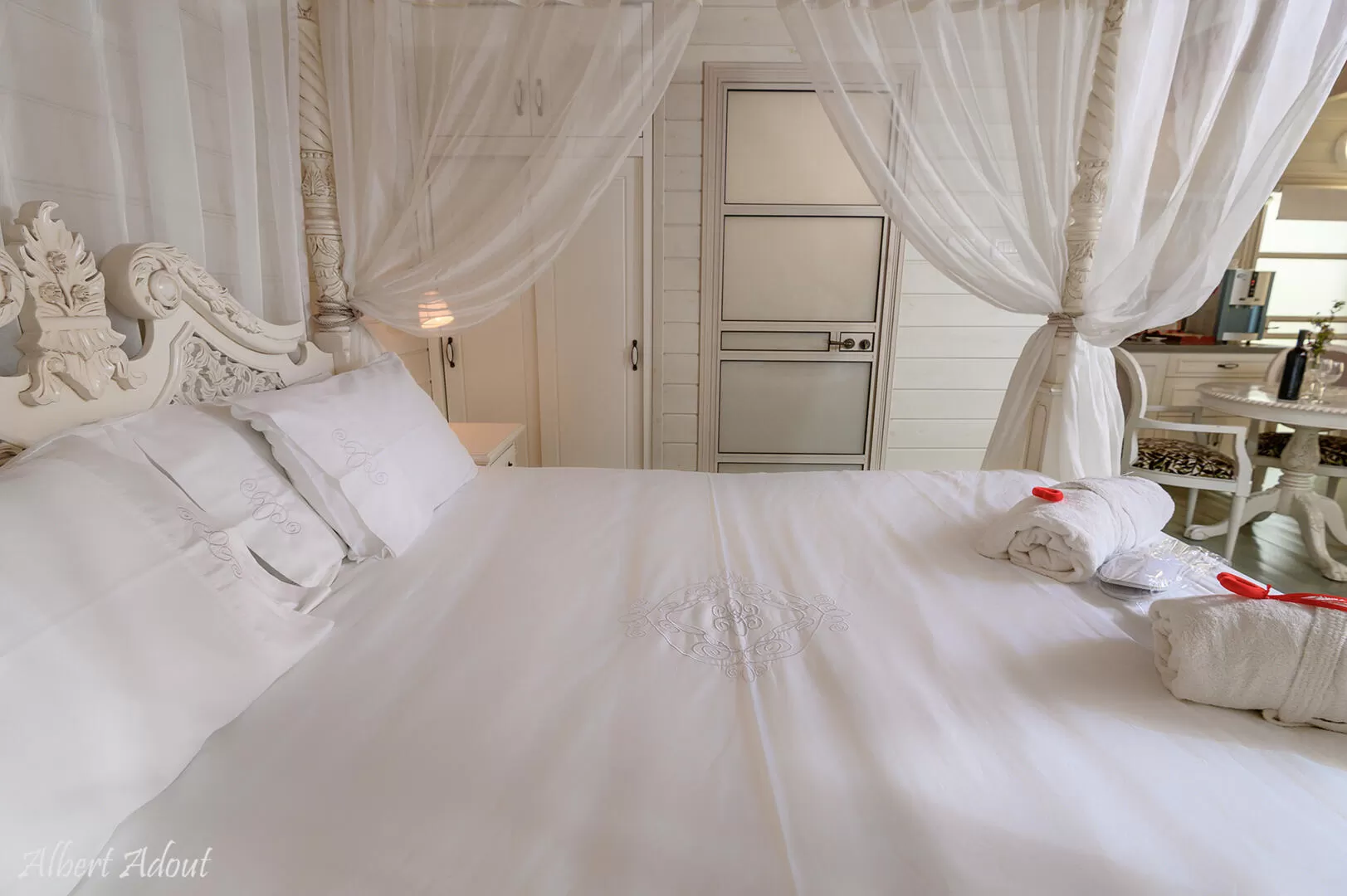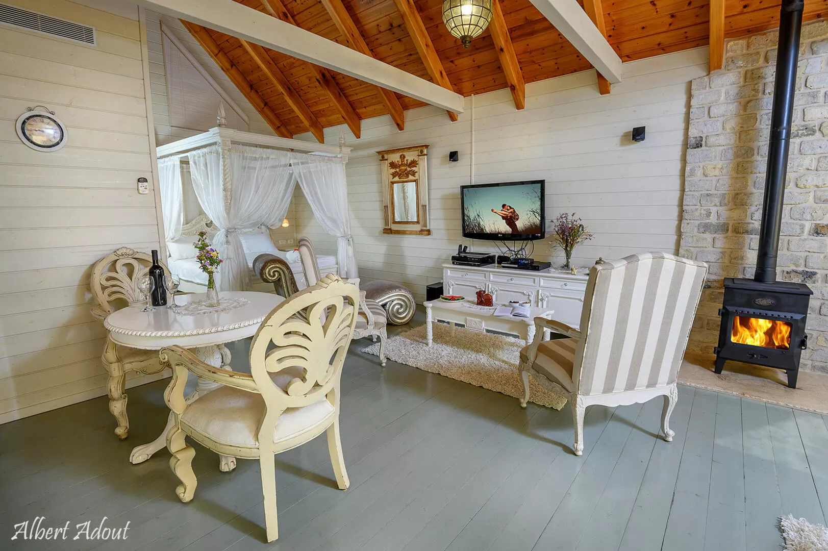 זה התחיל עם סיור במתחם המגונן ובשלוש הבקתות המטופחות. הן די קרובות אחת לשניה וגם לבית המארחים, אולם תכנון נבון וצמחיה מתאימה מאפשרים פרטיות. אין למתחם נוף מיוחד, אולם עושה רושם שהעיצוב הפנימי מפצה על כך היטב: סיור בבקתה מגלה חלל אחד צבוע בגווני שמנת, רצפת עץ בהירה ותקרה גבוהה, אבל העניין הוא העיצוב. "איך הצלחת לשכנע את ארמון ורסאי לתת לך רהיטים?" אני שואל את אנט למראה מיטות אפריון ופינות ישיבה בסגנון עתיק.