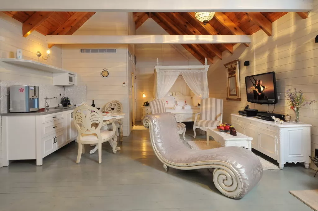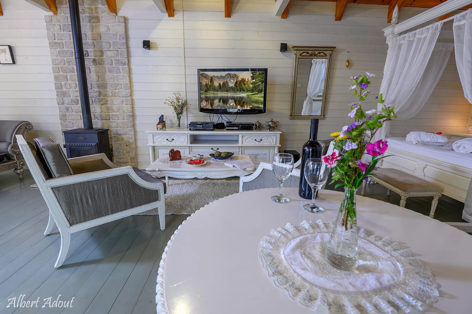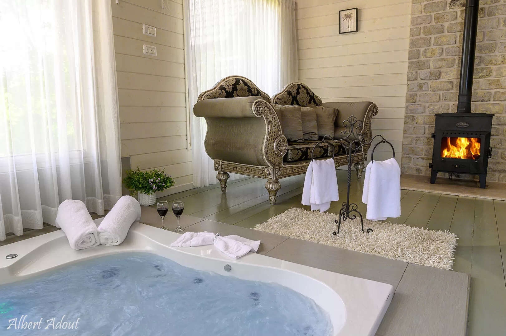 זה התחיל עם סיור במתחם המגונן ובשלוש הבקתות המטופחות. הן די קרובות אחת לשניה וגם לבית המארחים, אולם תכנון נבון וצמחיה מתאימה מאפשרים פרטיות. אין למתחם נוף מיוחד, אולם עושה רושם שהעיצוב הפנימי מפצה על כך היטב: סיור בבקתה מגלה חלל אחד צבוע בגווני שמנת, רצפת עץ בהירה ותקרה גבוהה, אבל העניין הוא העיצוב. "איך הצלחת לשכנע את ארמון ורסאי לתת לך רהיטים?" אני שואל את אנט למראה מיטות אפריון ופינות ישיבה בסגנון עתיק.