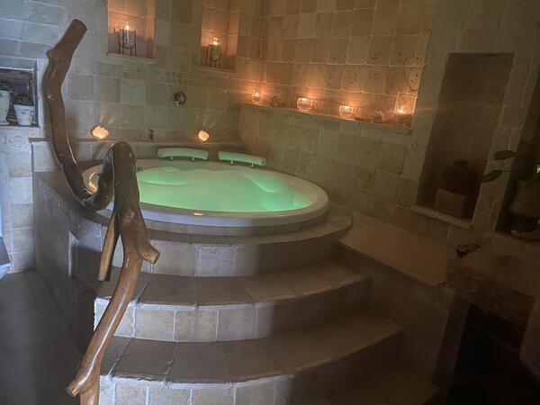 חדר הרחצה מרהיב, ונמצא בתוך חלל ענק ויפהפה המכיל ג'קוזי פנימי (בנוסף לג'קוזי ספא הנמצא על מרפסת הנוף).