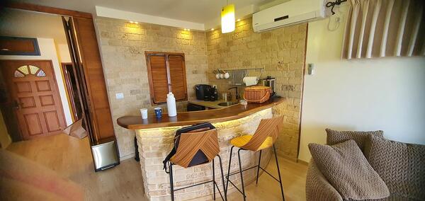 בחלל התחתון ממוקם ג'קוזי ספא זוגי מוקף בחלונות לנוף. הסלון מורכב מספת אהבה אסימטרית מעור איכותי ושולחן מרהיב מעץ טבעי. מטבחון עם שולחן בר צמוד המכיל בין היתר מכונת אספרסו, משלב עץ ואבן ומשרה אווירה של פאב אירי אוטנטי.