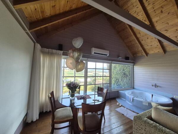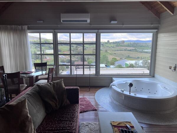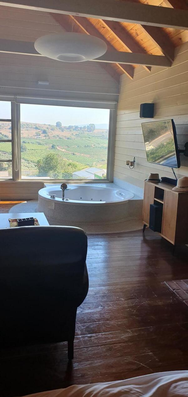 ג'קוזי לבן עגול במסגרת מרוצפת נוצצת הנמצא ממול גם הוא צמוד לקיר השקוף ומאפשר זווית צפייה טובה לנוף. לכל בקתה צמוד שטח מדשאה גדול, גינת תבלינים, ערסל ופינת פיקניק.