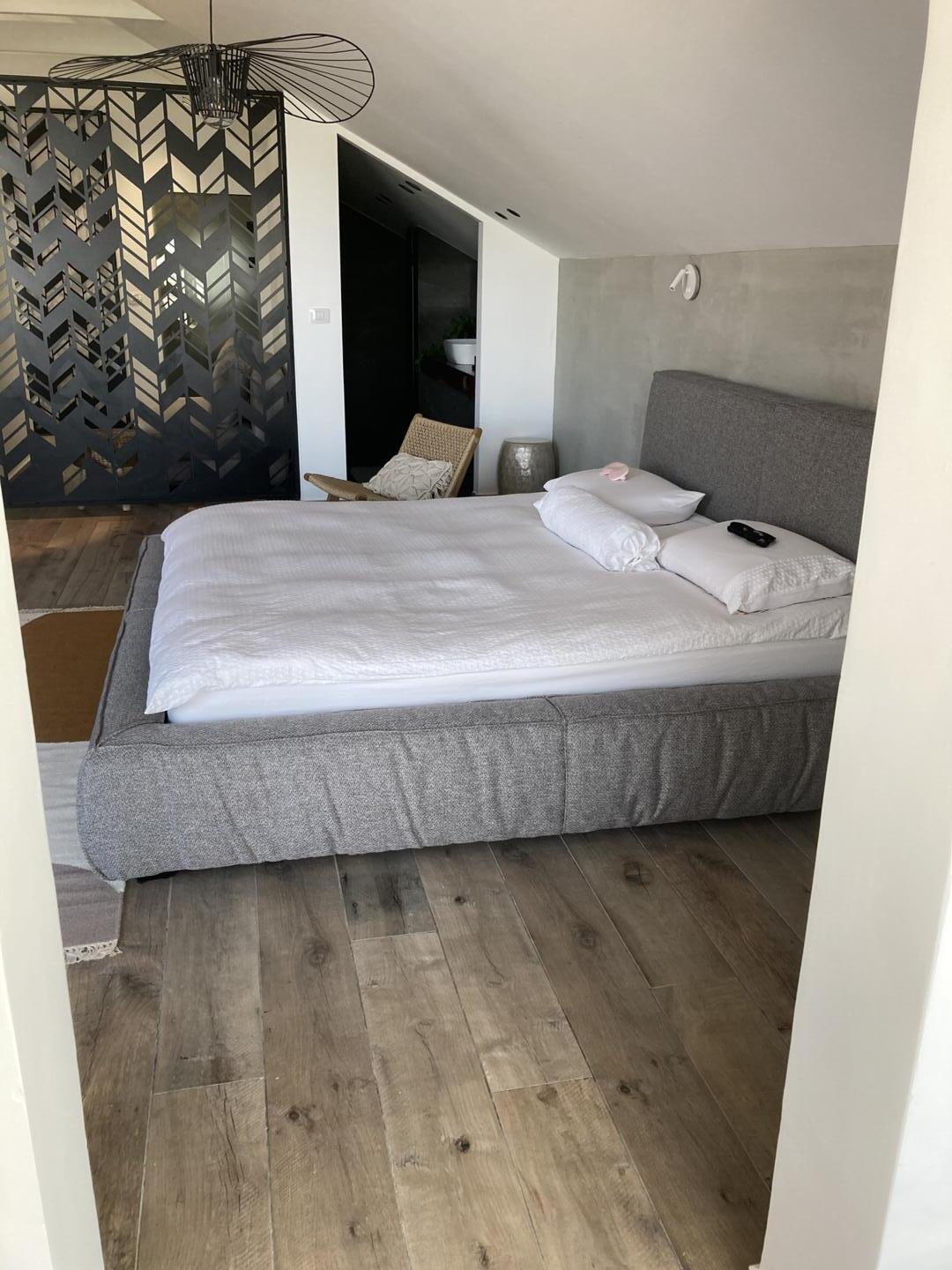 הסוויטה היא לופט מרווח המעוצב בצורה מודרנית ונעימה. סוויטה אחת בלבד במתחם, העיצוב מונוכרומטי ברובו עם נגיעות של צבעוניות חמה, מה שמשתלב היטב בירוק והכחול של הנוף שבחוץ. החלל מחולק באופן חכם – אזור השינה מאחור עם מיטת קינג סייז מפנקת, והספה הענקית והרחבה שמוצבת מלפנים משמשת כאלמנט מפריד לחלל הסלון. בימים קרירים (כאלה לא חסר כאן) תוכלו ליהנות מקמין חשמלי מעוצב, וממקרר יין מצויד בכל טוב - ואם תרצו תוכלו להצטייד ביינות מעניינים נוספים מיקב רימון הפועל במושב. ישנה גם פינת אוכל מעוצבת ופרקטית וכמובן, מכונת קפה איכותית. אם אתם מגיעים עם ילדים, גם להם יש כאן פינה משלהם עם חדר קטן ואינטימי ובו ספה נפתחת וחדר רחצה פרטי.