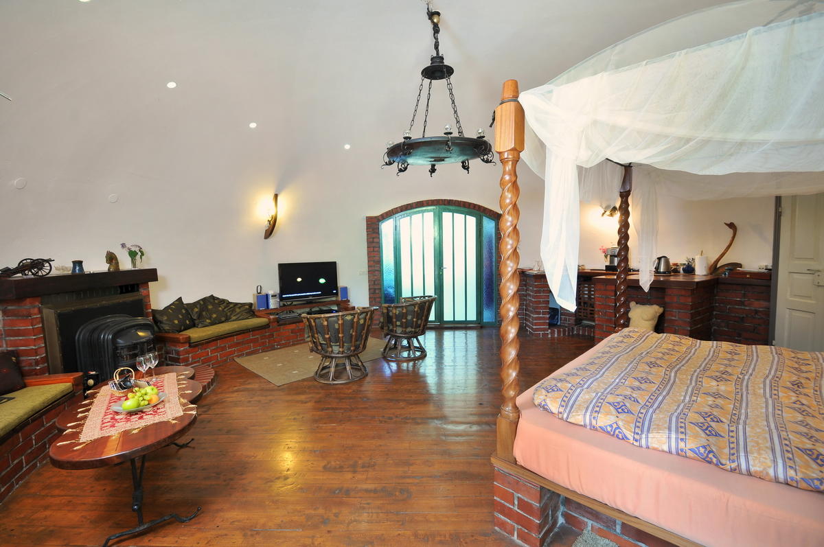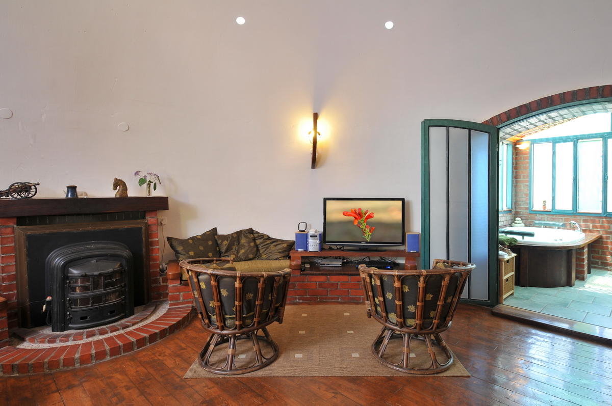 פינת הבידור כוללת מסך LCD ומערכת קולנוע, מול כורסאות קליעה כפריים. המטבח משלב לבנים ועבודת עץ ייחודית היוצרת יחידה וויזואלית אחת עם משטח עבודה ושולחן בר. שפע פרטי אומנות פזורים במקום, חלקם דקורטיביים, כמו פסל נשי באזור המטבח וחלקן בעלי שימוש יומיומי – כמו גוף תאורה מרהיב המשתלשל מהתקרה, שבנוסף לנורה חשמלית נושא עליו שפע נרות ריחניים או פתיליות שמן. להפתעתי הסתבר שמנורת תקרה ענקית זאת עשויה מגלגל עץ של עגלה עתיקה...