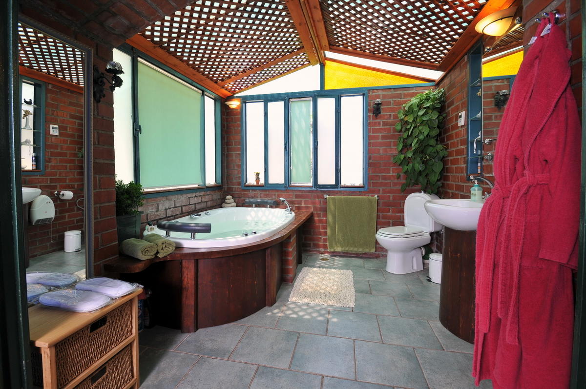 ג'קוזי נמצא בחדר סמוך המשלב חדר רחצה ומרפסת עטופת גפנים. העיצוב הצבעוני מבוסס על וויטראז’ים, ריצוף ייחודי, משחקי אור וצל. בחוץ – מרפסת – גינה עם שזלונגים ופינות פיקניק אל הנוף.