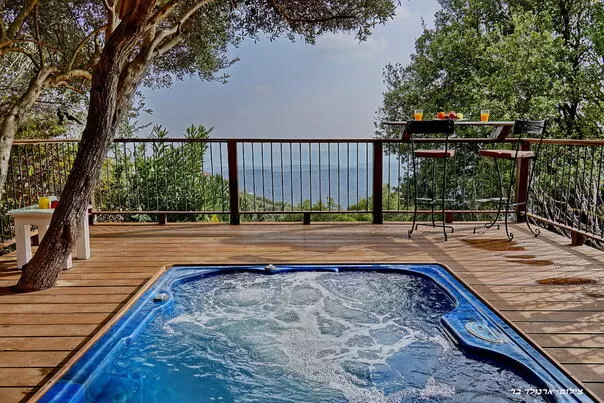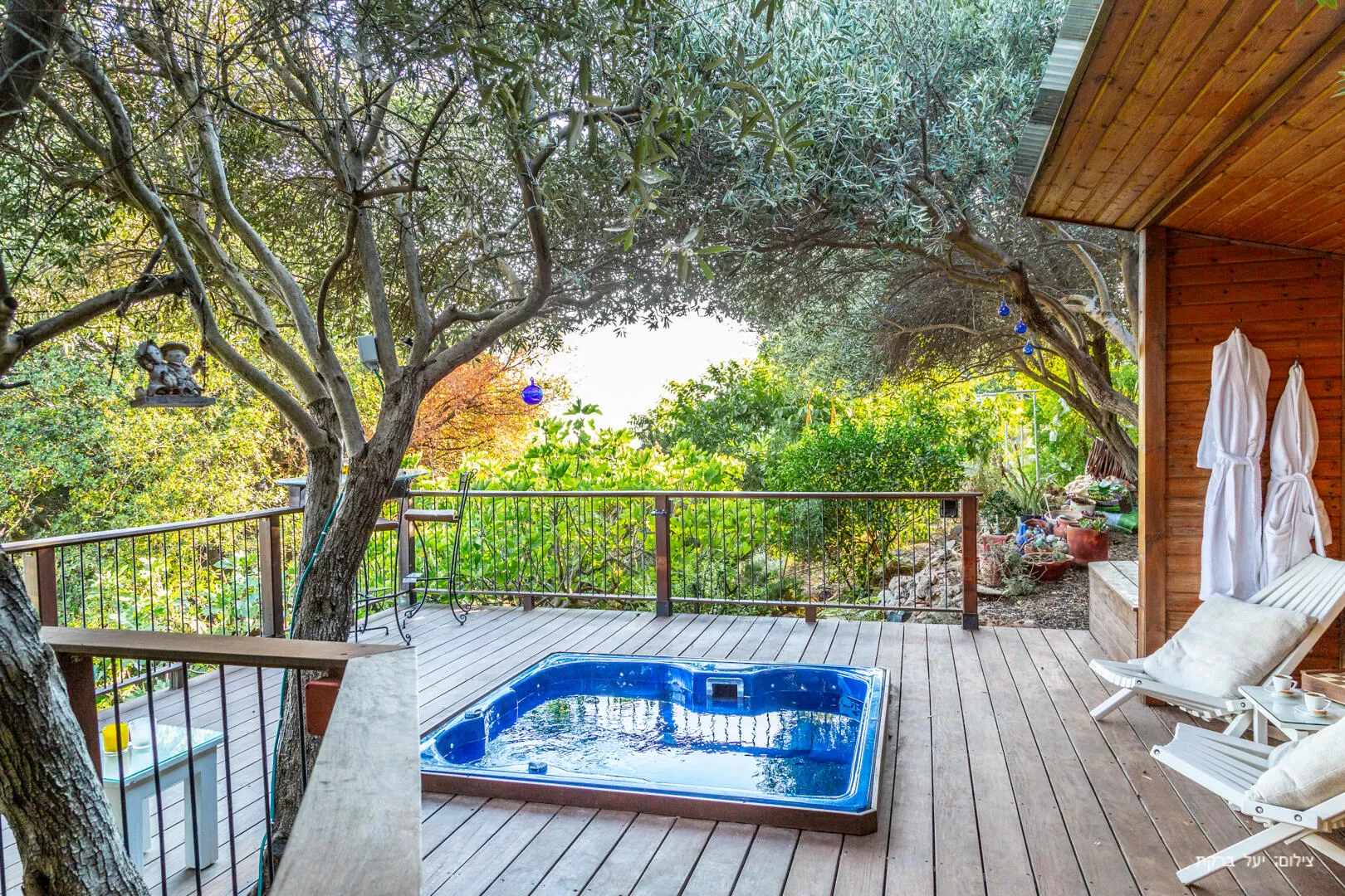 אם תצליחו להסיר את עיניכם מהנוף שבמרפסת, תגלו שמחוץ לצימר מחכה לכם עולם ומלואו - גן פרטי של עצי פרי ועצי זית, שמסתיר בתוכו פינה מפנקת במיוחד ובה ג'קוזי ספא ענק ולוהט תחת כיפת השמיים, טבוע ברצפת דק ומשקיף אל נוף מהפנט לא פחות מזה שראיתם מהמרפסת. יש פה גם פינות ישיבה ובר מול הנוף היפהפה - וכל מה שאתם צריכים להשלמת האווירה הוא רק יין טוב (הוא כבר יחכה לכם במטבח).