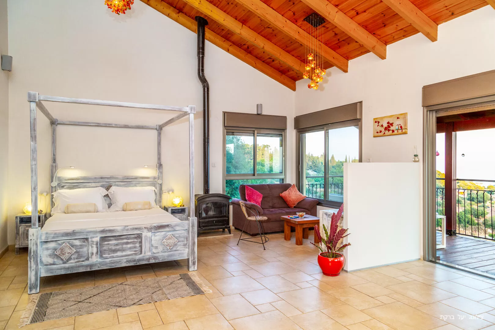 הבית של שירי הוא הצימר היחיד במתחם ואין כאן שכנים. אם אתם מחפשים את המילה האחרונה בעולם העיצוב - לא תמצאו אותה כאן. פה הווייב כפרי, גלילי וביתי - אבל כל כך נעים ומזמין. הריהוט נעשה בעבודת יד ע"י אמנים מקומיים. הסוויטה גדולה ומרווחת במיוחד (90 מטר כולל מרפסת הנוף) ומכילה מיטה זוגית גדולה, טלויזיה, מטבח מאובזר ומרווח עם אפשרות לבישול קל, שולחן אוכל, פינת ישיבה, חדר רחצה עם ג'קוזי ומתקן לחימום מגבות(!), ומרפסת דק תלויה באוויר מול נוף מהפנט.