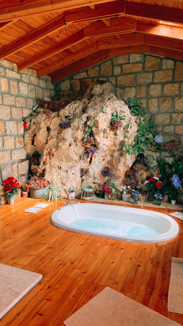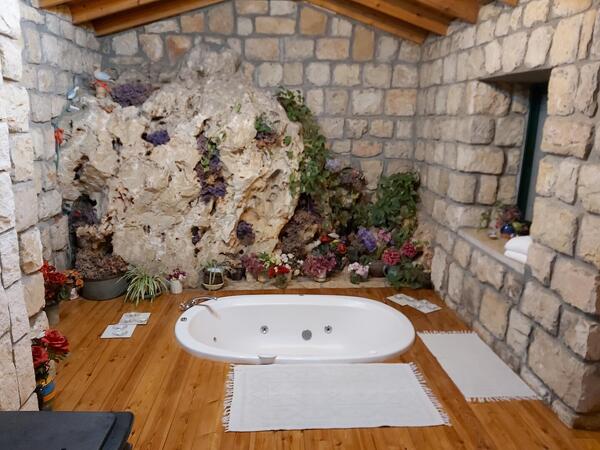 בקתת "ג'קוזי בסלע", נהנית (חוץ מהסלע) גם מגינה פורחת מעשה ידיו של אליעזר המארח, גנן במקצועו. הג'קוזי היפהפה סמוך לסלע מעט קטן, אבל מאוד נעים ואינטימי. הסלע שמשולב בקיר הבקתה מואר בתאורה נעימה המקיפה אותו, עם נישות בהן גדלה הצמחיה בטבעיות. יש שם חלון הצופה לצמחיה שבחוץ, וכן חלון "סקייליט" המאפשר לתאורה הטבעית לחדור מבחוץ אל תוך הבקתה. משלים את האווירה קמין עצים לימות החורף הנמצא ממש בקרבת הג'קוזי.