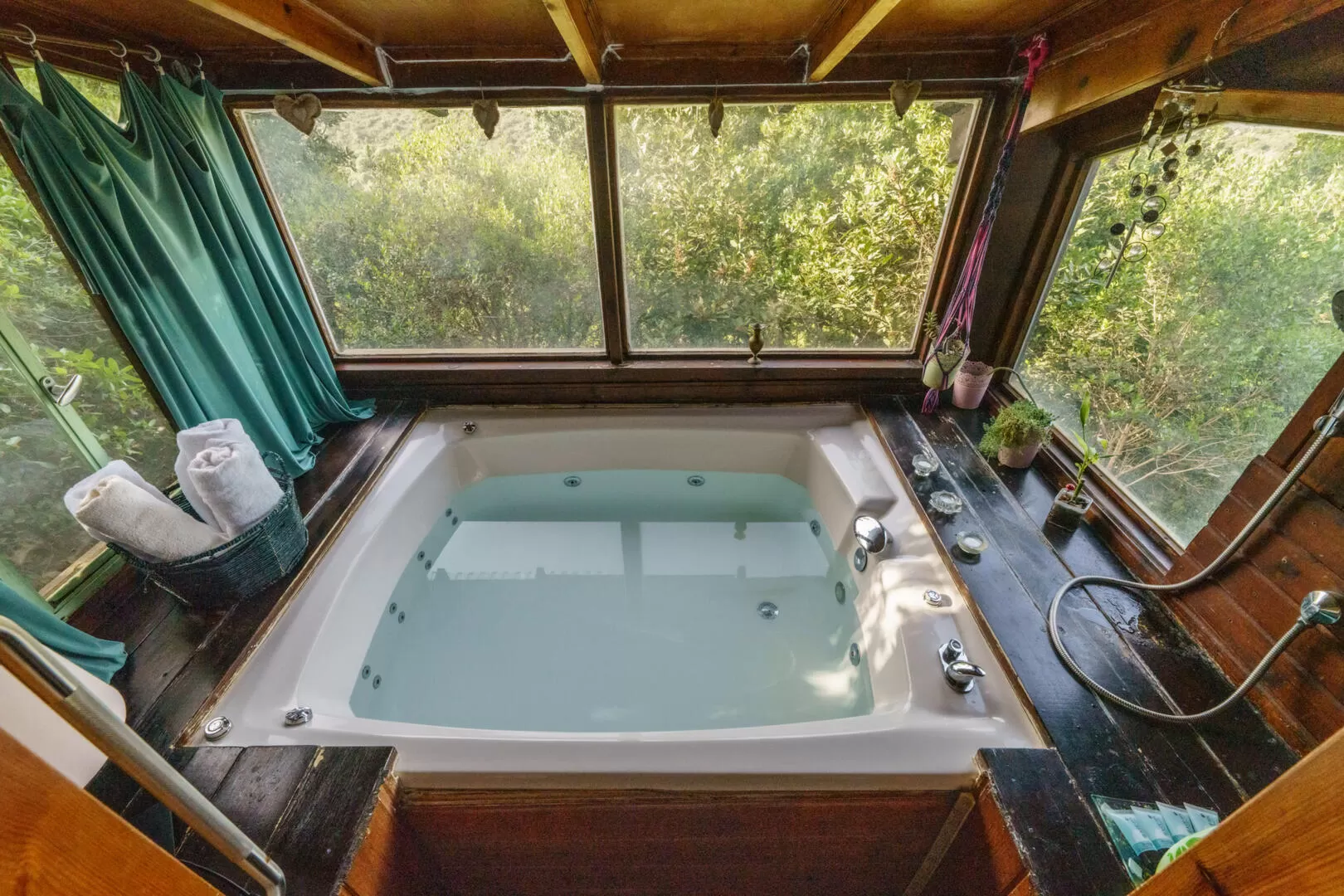 מתחם החוץ של הבית סגור ופרטי, והוא מציע חצר פרטית מוצלת על ידי האלונים שצומחים כאן, ג'קוזי ספא גדול ומבעבע ופינות ישיבה. אם תרצו לצאת לטיול ביער הקסום והמבודד, תגלו שביל גישה ישיר מתוך החצר שמוביל למעיינות ולטבע פראי.