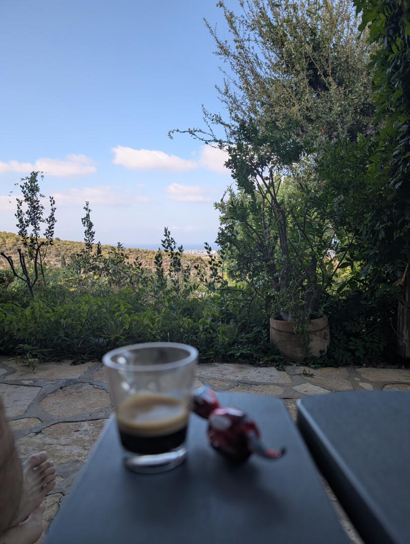 עוד יצירת אמנות פה היא הקפה המעולה שטל מכינה לי במכונה מקצועית לגמרי. זה עושה לי חשק לצאת החוצה ושם אני מוצא דק מוצל, מוקף צמחיה. הדק מופרד במחיצה מיחידה נוספת שמשמשת לעתים רחוקות את ביתה של טל, אבל התחושה היא של פרטיות ואינטימיות – רק אני והנוף הדי מטורף מערבה אל הים. הבית של טל הוא אולי הגבוה ביותר בעין הוד וזה אומר אחלה נוף. זה אומר גם שהשריפה הגדולה בכרמל כמעט הגיעה אליו. מזל שלא.